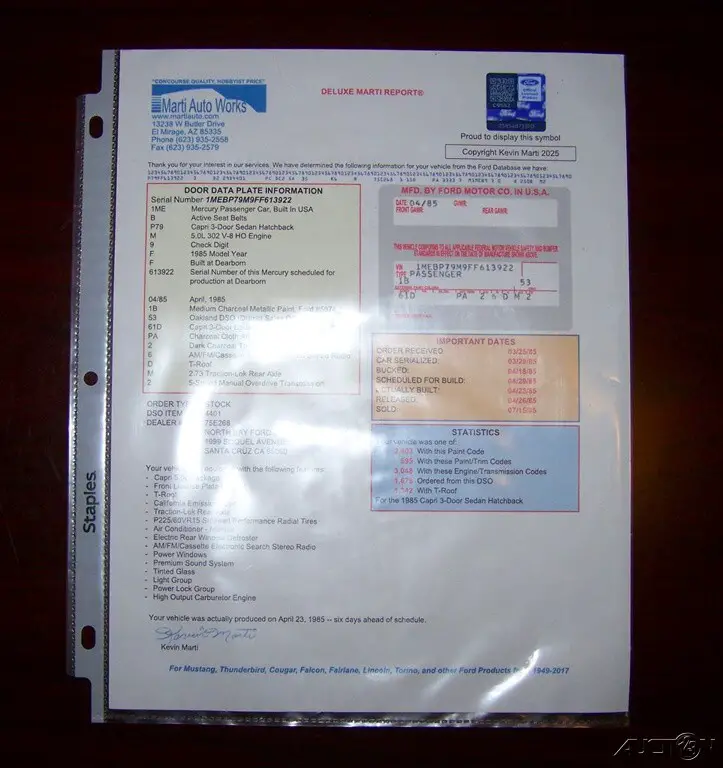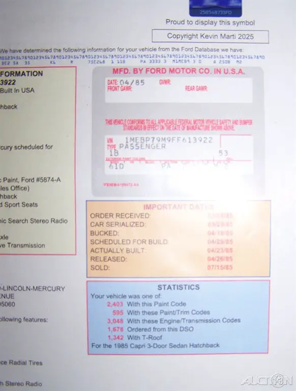 If your not viewing this vehicle on our website. Please view the 165 plus photos on our website at cherokeeautogroup.com Type in search 1985 Mercury Capri in search tab! Check out this very special 1 of only 1342 built original stock condtion 1-Owner 82k original mile California car 1985 Mercury Capri 5.0L 4-bbI, 5-Speed, T-Top, bubble hatchback that we are offering! This car was never modified. As you know they are on a Fox Body platform shared with the Ford Mustangs of this era. This beauty was sold brand new to a Mr & Mrs Higgen on 7-15-1985 @ North Bay Ford Lincoln Mercury in Santa Cruz Ca. They owned this one for almost 40 years until they parted ways with it & now it is with us in Georgia. This car is a real nice original condtion hard to find 5.0L Capri! Its truly a excellent examp