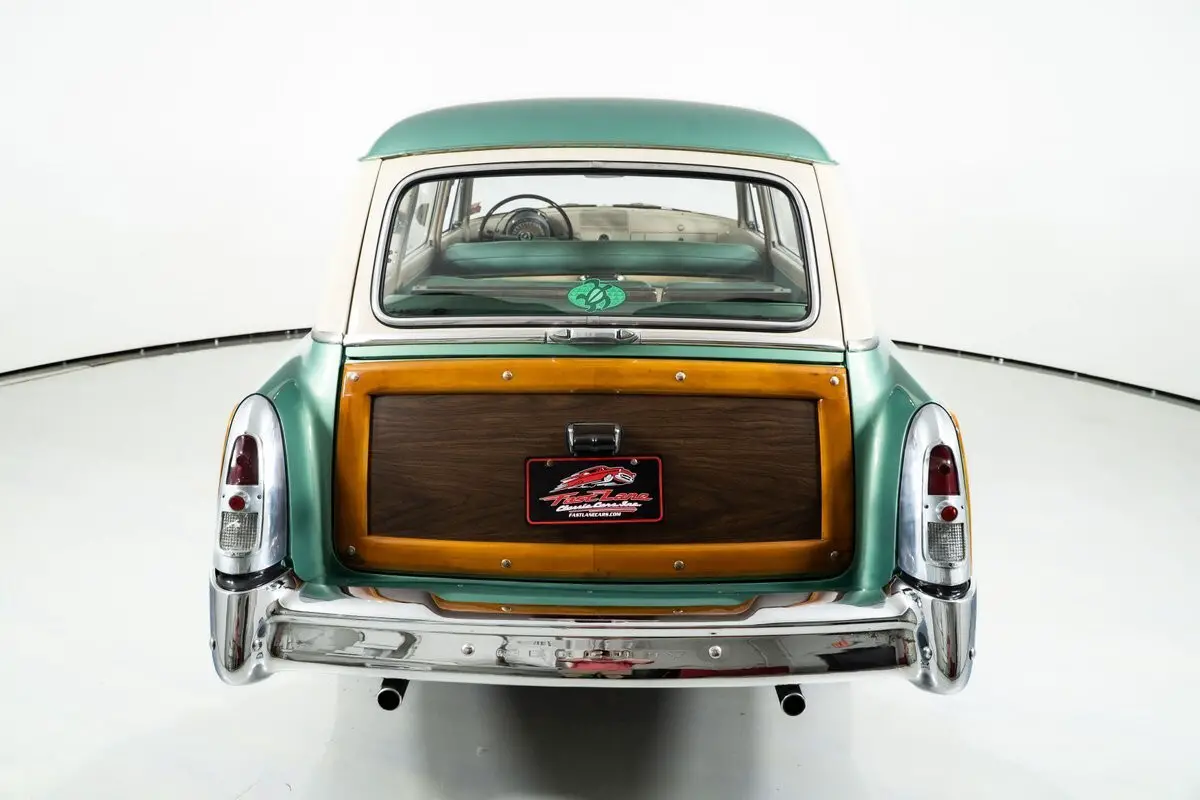 The green and cream exterior is accented by classic wood paneling, while the matching interior features three rows of seating. The seat upholstery is believed to be original, complemented by new carpet. With only 44,000 miles believed to be original, this