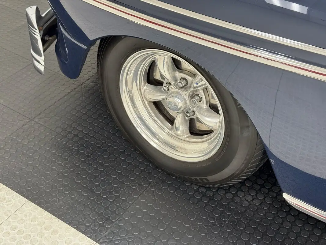 Clean underneath with minimal surface rust, a few drops of oil about, and clear knuckles. The chrome flywheel and differential covers are a nice touch and the dual exhaust flows through Turbo mufflers before finding its way to stainless tips out back. Brakes are split between power disc in front and power drums in back and suspension has been upgraded to a Mustang II front end while retaining leaf springs in the back.