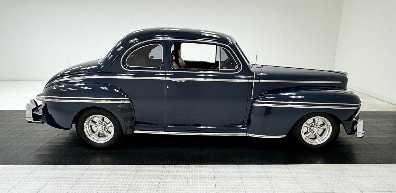 For consignment, a 1947 Mercury Series 79M coupe showing 17,227 miles, but the true miles are unknown. This street rodded version of a once compact car now emits big energy with a V8 under the hood and dual exhaust emerging out back.