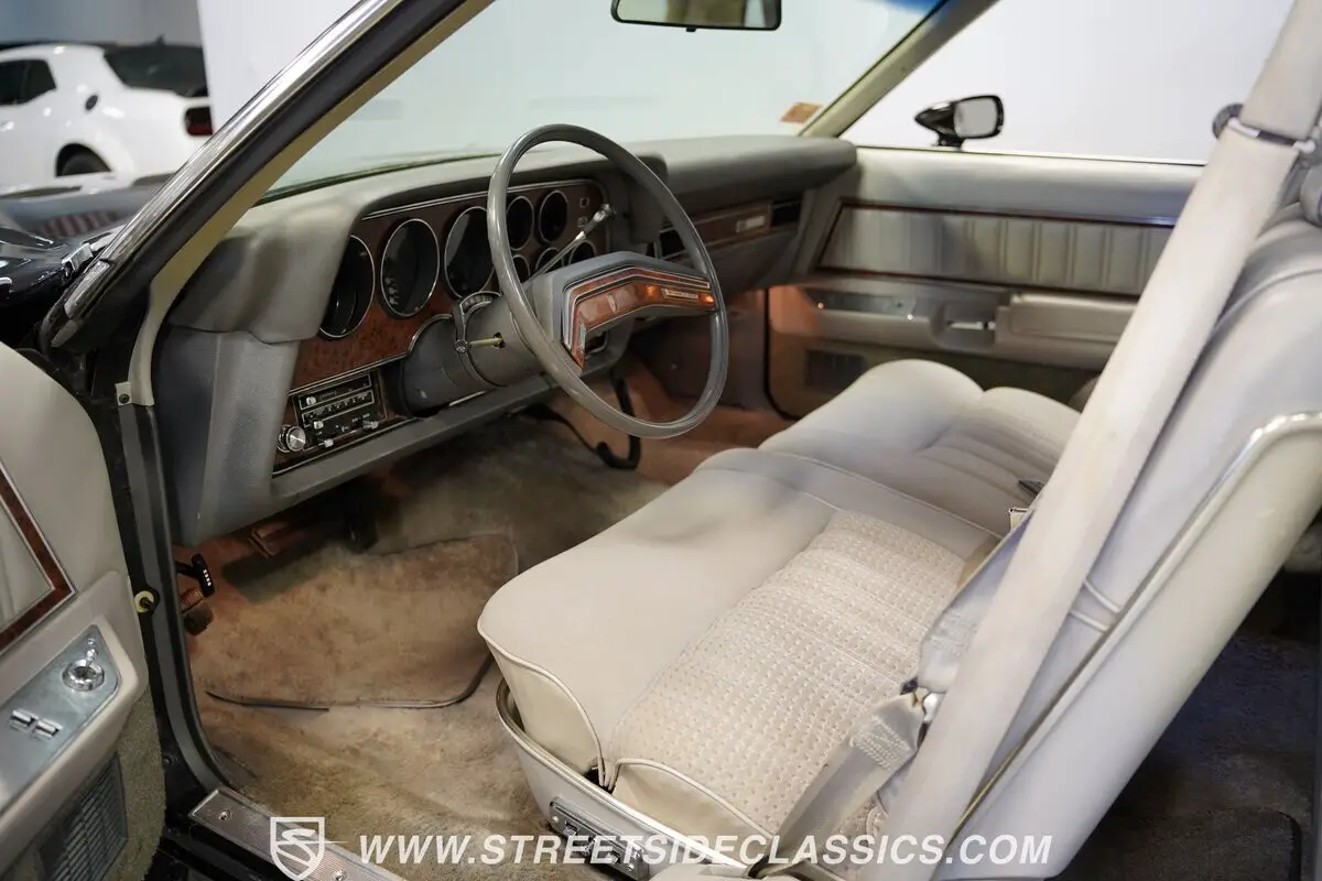 Inside, the Dove Grey cloth interior remains in exceptional condition, validating the incredibly low odometer reading. The bucket seats provide both comfort and support, working harmoniously with the column-mounted shifter for a spacious cabin layout. Gauges on the dashboard remain clear and legible with minimal wear on control surfaces, while the steering wheel displays limited use throughout the years. Luxury appointments include power windows, power seats, power locks, cruise control, and factory air conditioning for a first-class driving atmosphere. An AM/FM radio with 8-track player rounds out the cabin, offering authentic late-70s audio options.