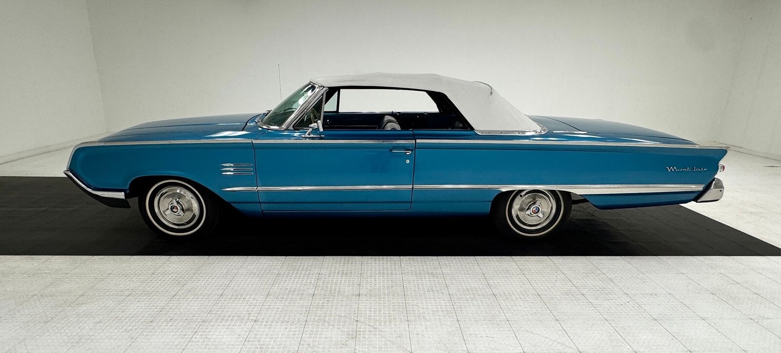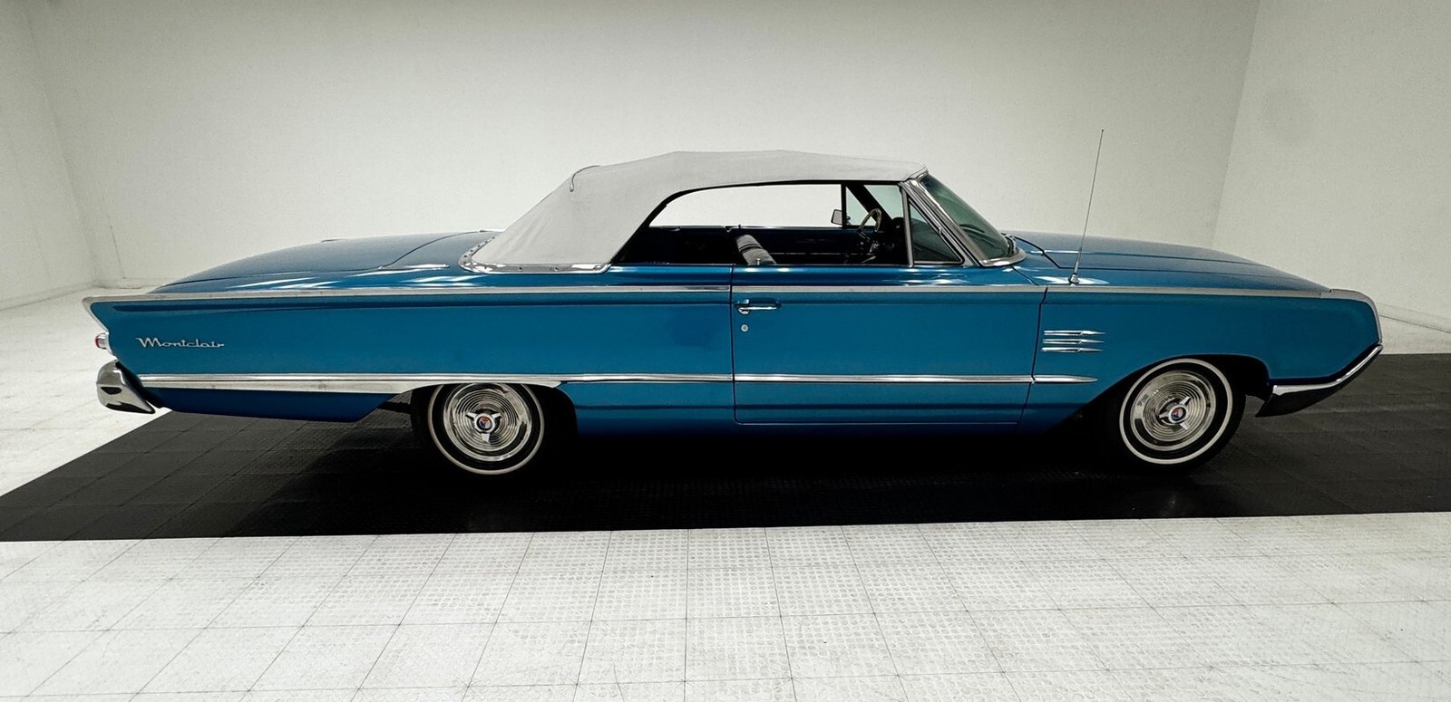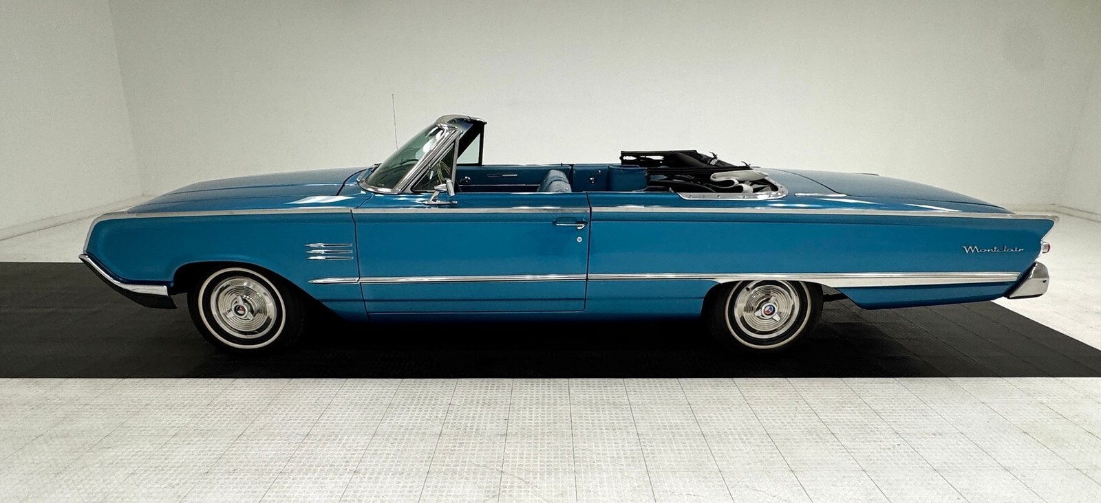An almost dizzying array of patterns make up the triple paneled door trim with dark blue cloth sandwiched by a lighter hue in vinyl and other than a worn armrest, both doors present cleanly. The split bench shows some discoloration in the blue vinyl sides, but the cloth inserts are in nice shape. Clear acrylic on the top arch of the steering wheel has some typical yellowing but frames a frames a dash that combines 50's vibes with the jet age configuration of ported gauges lined in metal, a ribbed metal mid panel, and a contouring horizontal speedometer, so cool that we an overlook the minor patina. In the center, under big Mercury lettering, is an AM radio, vent levers, and the requisite clock. Blue loop carpet is also in great shape and the white canvas top and clear rear plastic window are ready for show. The trunk follows suit and is capped by a black fitted carpet mat.