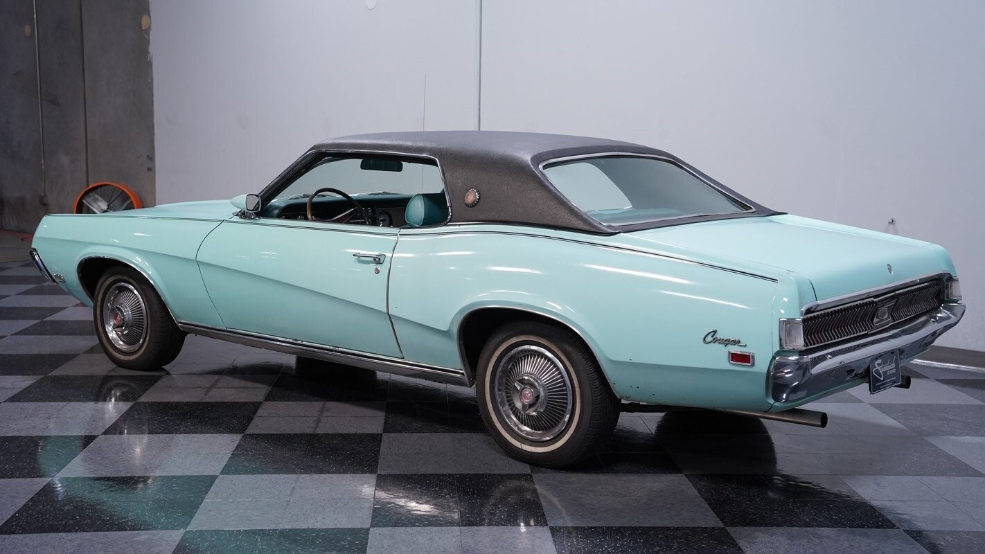 This highly original 1969 Mercury Cougar XR7 is a classic car lover's dream come true. Finished in a beautiful Light Aqua Blue with a subtle black pinstripe, this Cougar looks ready to prowl the streets. It rides on a set of 14" wheels, wrapped in 205/70R14 tires that provide a perfect period-correct stance. The paint presents well for its age. The chrome bumpers and trim pieces add just the right amount of shine, while the hidden headlights give the front end a sleek, uncluttered appearance.