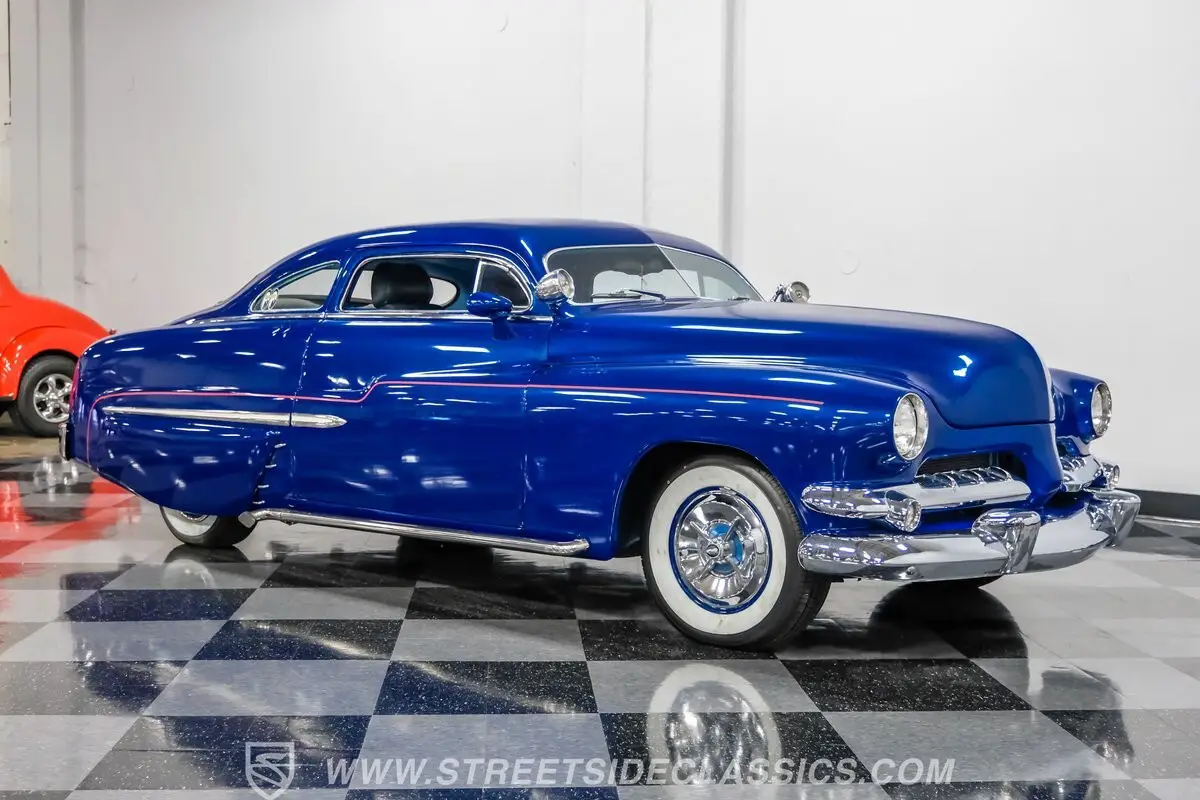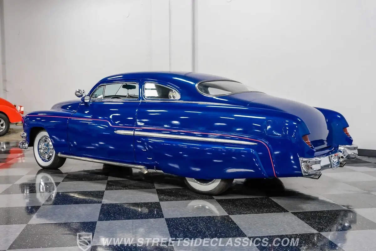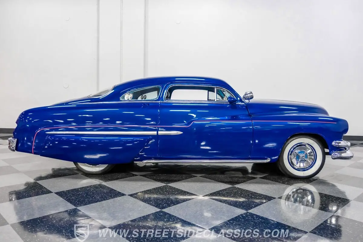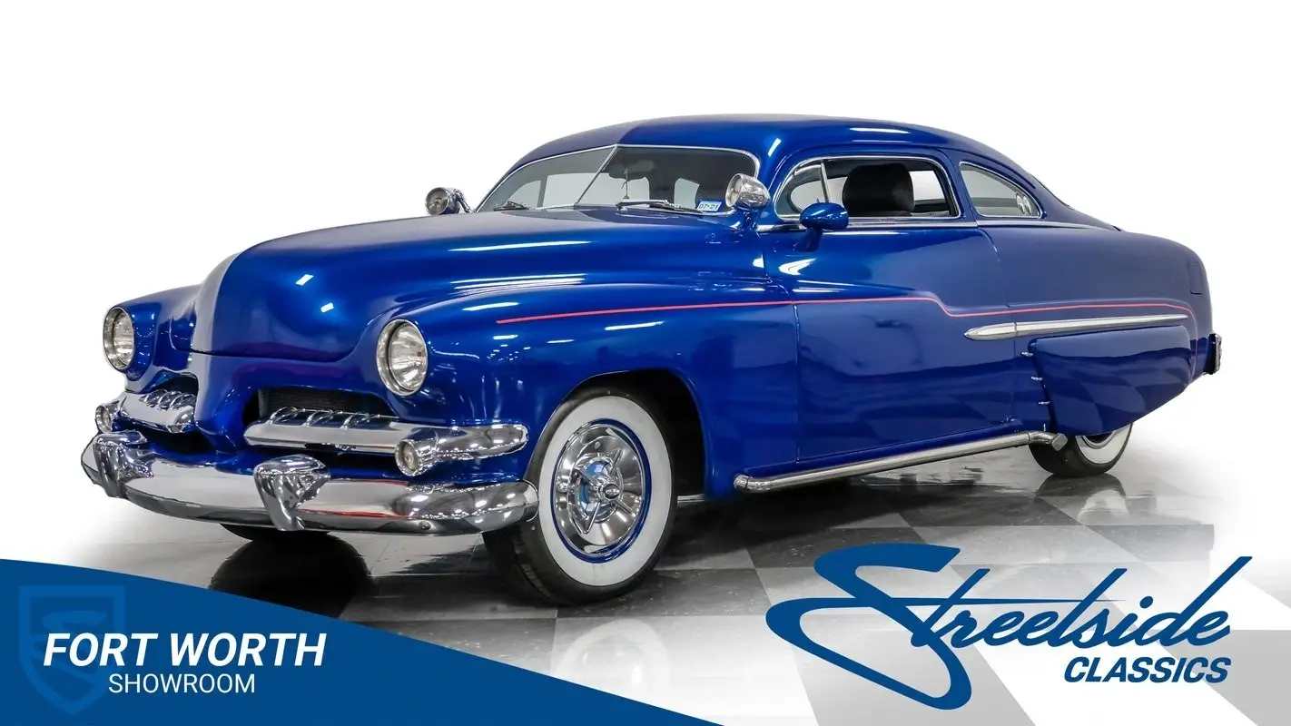 Owning a classic car means carrying a piece of history wherever you go. This 1951 Mercury Lead Sled Restomod brings that history to life with blue paint and red pinstriping applied two years ago, a 4.5-inch roof chop, Frenched headlights, rounded hood corners, a '55 Dodge front bumper and grille, and '55 Chevy taillights fitted with '54 Mercury lenses. Faux lake pipes and whitewall tires complete the vintage, custom look as it rolls down the road with unmistakable style.