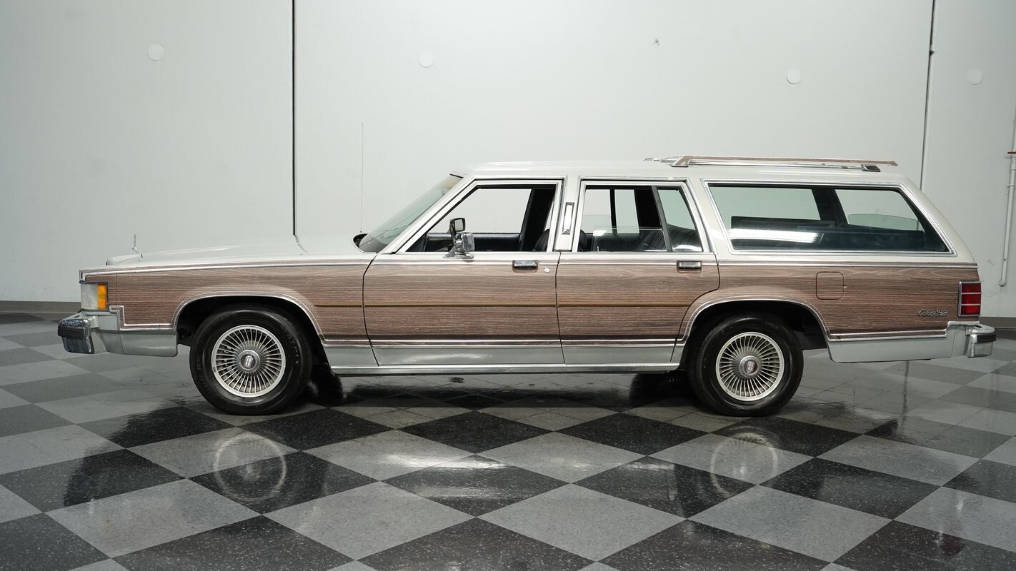 American family hauling at its finest, this 1987 Mercury Grand Marquis Colony Park Station Wagon presents in a sleek silver finish complemented by classic woodgrain paneling across its flanks. With just 71,985 believed actual miles, this spacious wagon maintains its imposing presence with clean lines and substantial proportions. The front grille announces its arrival while the roof rack adds both functionality and visual interest. Rolling on 15-inch factory wheels wrapped in 215/70R15 tires, this Mercury combines traditional styling with practical transportation. The complete package is a great example of late '80s luxury wagon design with its
