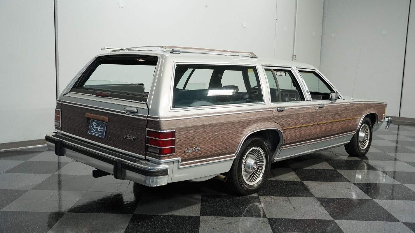 American family hauling at its finest, this 1987 Mercury Grand Marquis Colony Park Station Wagon presents in a sleek silver finish complemented by classic woodgrain paneling across its flanks. With just 71,985 believed actual miles, this spacious wagon maintains its imposing presence with clean lines and substantial proportions. The front grille announces its arrival while the roof rack adds both functionality and visual interest. Rolling on 15-inch factory wheels wrapped in 215/70R15 tires, this Mercury combines traditional styling with practical transportation. The complete package is a great example of late '80s luxury wagon design with its distinctive profile and generous glass area.