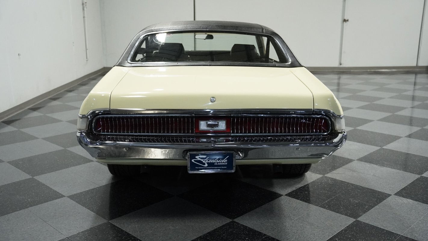 Family-owned since 1970, this 1969 Mercury Cougar in Light Ivy Yellow combines classic style with modern performance upgrades. The body lines flow with Mercury elegance, accentuated by a black vinyl top in excellent condition. American Racing 17-inch wheels add a performance look, fitted with Continental tires - 225/50R17 up front and 255/45ZR17 in the rear. The distinctive sequential taillights and trademark hideaway headlights complete the iconic Cougar appearance that muscle car fans appreciate.