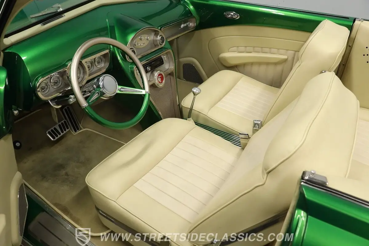 Step inside to a custom interior that balances period charm with contemporary comfort. The cabin features matching painted dash, doors, and wheel trim, Classic Instruments gauges, a chrome tilt steering column, and a clean center console with Lokar floor shifter and RideTech controls. A Pioneer CD receiver and Vintage AC controls provide modern convenience, while front seatbelts, a matching vinyl boot cover, and a neatly trimmed trunk add thoughtful finishing touches.