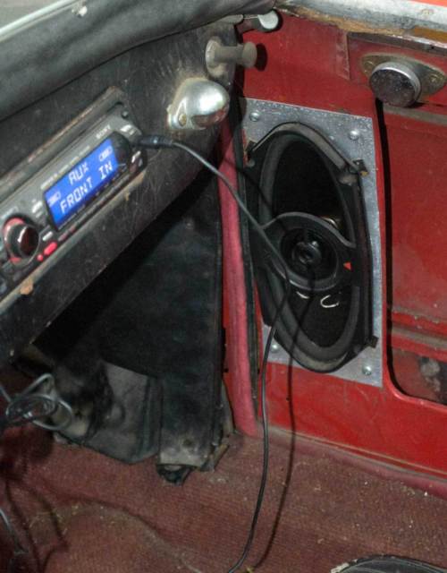 The radio and speakers are about 4 years old—it takes CDs and you can plug in an iPod. The car is now negative ground. It turns out that there is nothing in the car that is polarity dependent other than the radio!! The speakers are in the door because there is no other place to put serious speakers. The car has a Maserati airhorn, which I think is important for safety.
