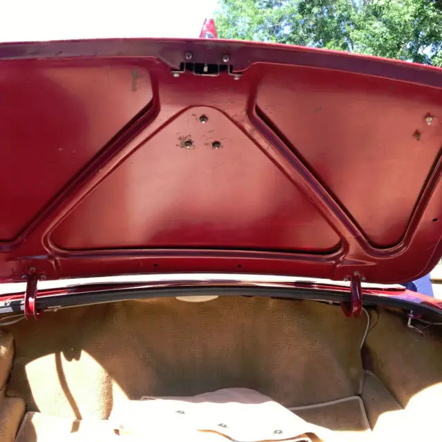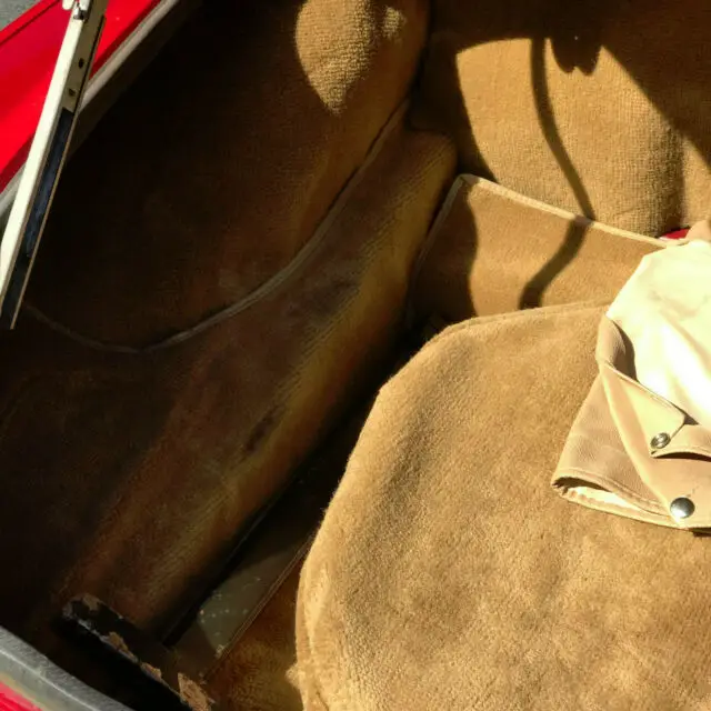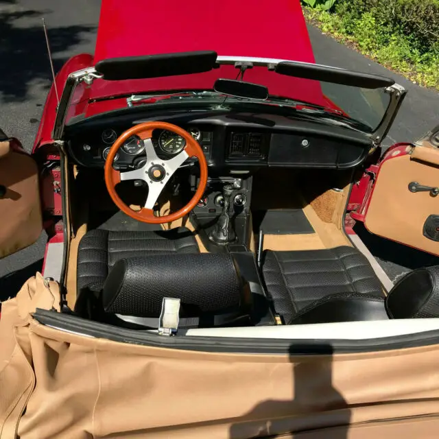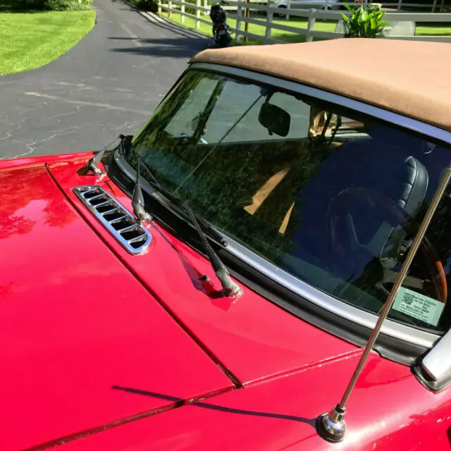 The interior features a four spoke 14” wood steering wheel, black dashboard and console, tan leather padded doors and tan carpeting in the interior, trunk and boot. The black seats were reupholstered shortly after the car was purchased along with a new soft convertible top and boot cover. The windshield wipers operate properly and have 3 new blades.