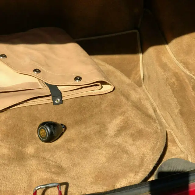 The rubber bumpers have a modern look combined with the wire headlight protectors. It has a passenger side mirror, boot rack, 14” Rostyle wheels, and tires with less than 2,000 miles on them. The car was involved in a non-moving accident in ‘06’ where a truck backed into the front end causing $2,600 in damage. Invoice is available. There is slight paint bubbling on both rocker panels and one small rust spot on the right side. There are also several dings in the passenger door molding. Car has always been garaged, never seen snow, and only driven on sunshine friendly days or moonlit nights.