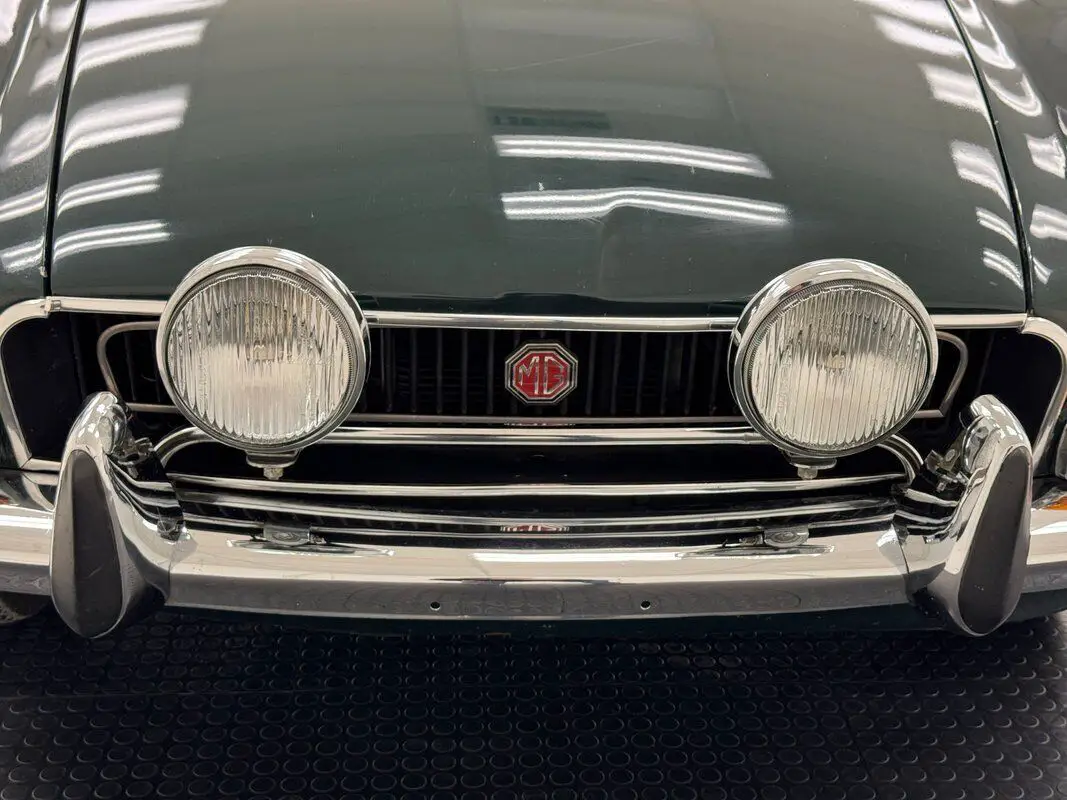 With gaps well minded and steel straight we see the exterior bathed in a respray of Dark British Racing Green, the paint is nicely done. However, we do notice some scratches, inclusions in the finish and and some evidence of body filler in the lower panels along with a dent in the rocker and the rear wheel arch pulled down and out in one spot. The chrome is mirror like and shows no pitting, all trimmings are in equally good condition, and the 3 wipered windshield is crystal clear. The convertible top is in very good condition but does have a small tear on the passenger's side near the corner window. Fog lights have been added up front, and black rubber dressed chrome bumperettes are on both the front and back. Like new 175R14 blackwall tires with a matching spare wrap 14-inch MG chrome wire knock off wheels. A shout out to the truck, which presents with no rust and contains not only a full-sized spare on a wire wheel but also a tool bag.