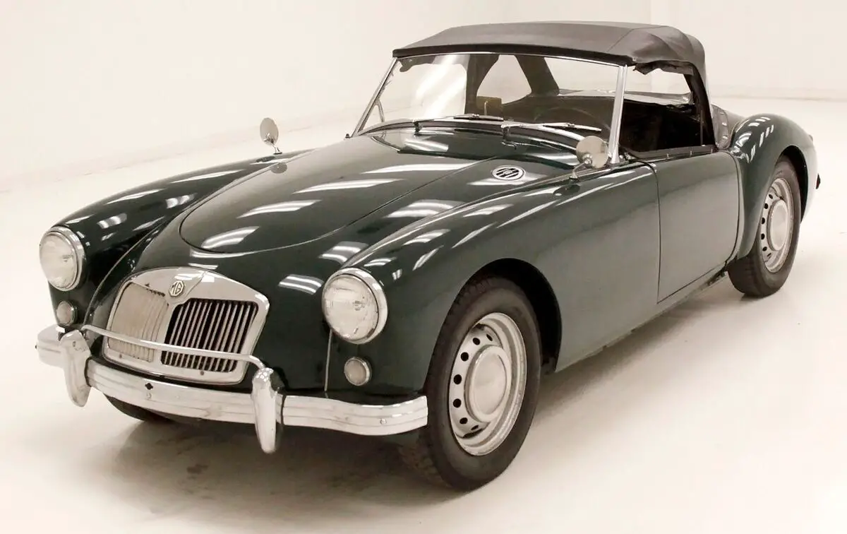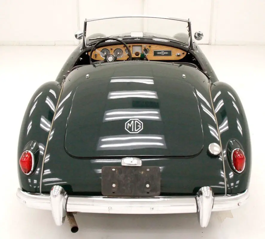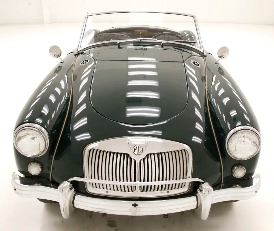 For consignment, a restored in the 1990's small cruiser with its British Motor Industry Trust certificate, workshop manual, and a phonebook's worth of restoration receipts and photos, all in 1958 MGA roadster form. All correct on the chrome and body front, coming with its side curtains, a nice convertible top, a wonderfully tasteful interior black coloring accenting the classic British Racing Green color change exterior, and 1958 never looked so good!