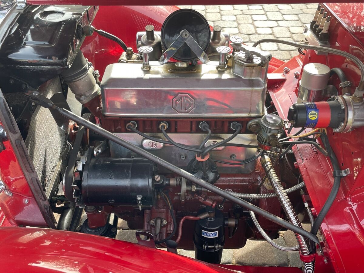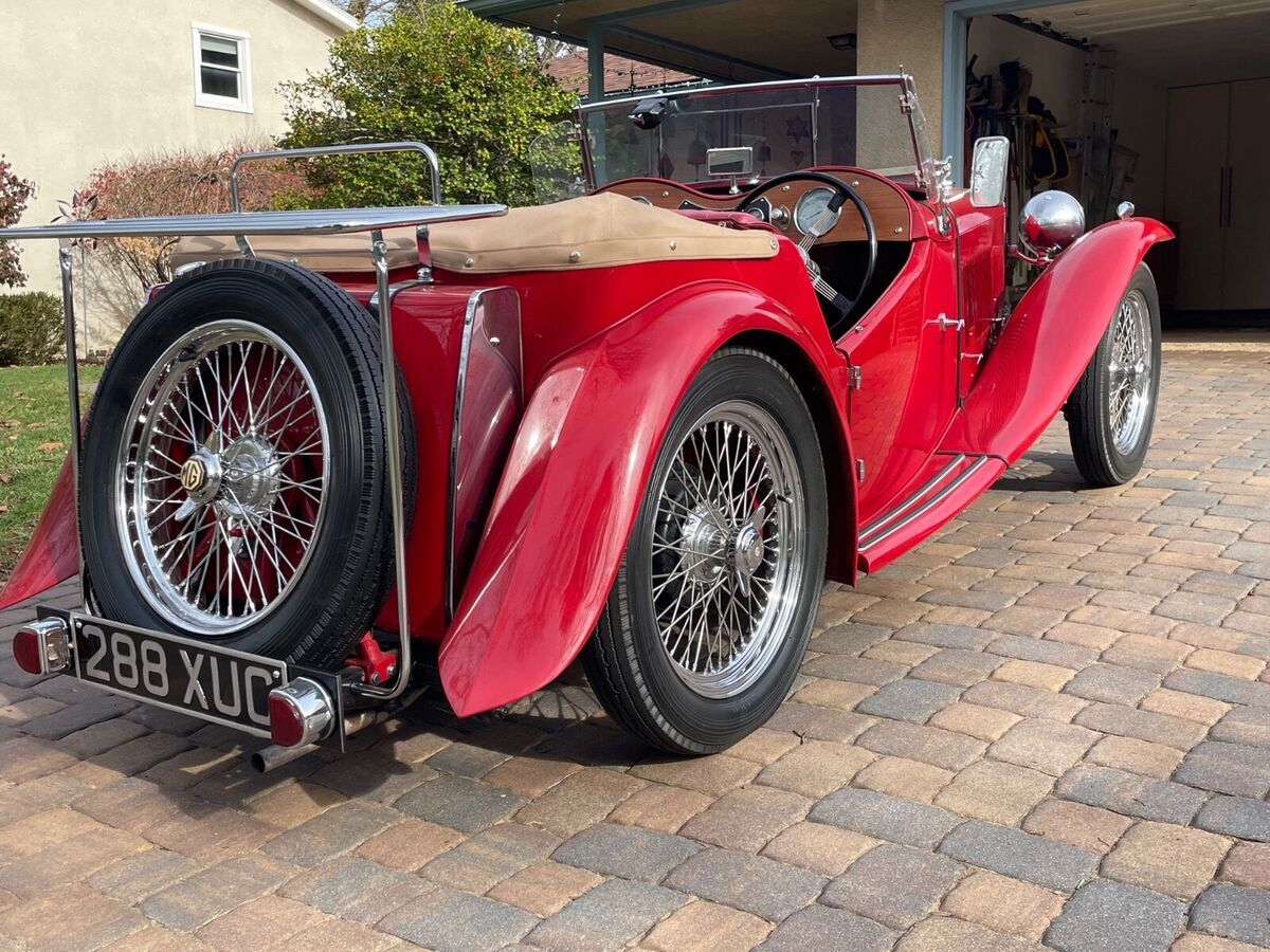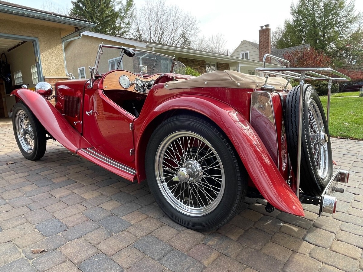 1947 MG TC - Beautifully restored and beautifully kept since then, high quality throughout! Runs & drives great! 1250 CC MG XPAG engine - matching numbers - dual SU carburetors, with some nice upgrades - oil filter, and generator, complete new wiring harness, new walnut dashboard with LED dash lights & working instruments!The Red paint is excellent, the interior and the chrome is excellent! It has accessory luggage rack, and comes with the adapter for installing a dual spare tire (not installed) The seats are beautifully finished in red leather, the undercarriage is clean, the chrome wire wheels are brilliant! The tires are new with new tubes. This car shows the quality of the restoration, the overall impression is sparkling! A wonderful car that is exciting and fun to drive! Clean Ohio title, ready to enjoy now!