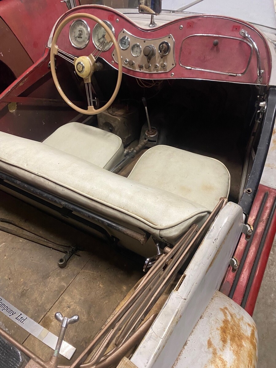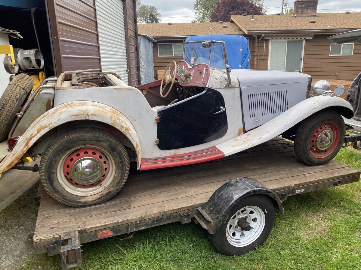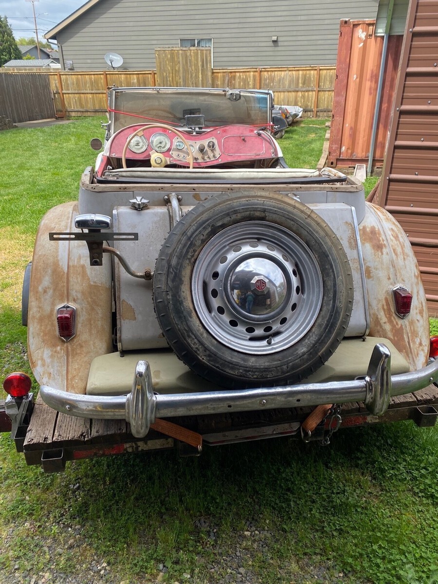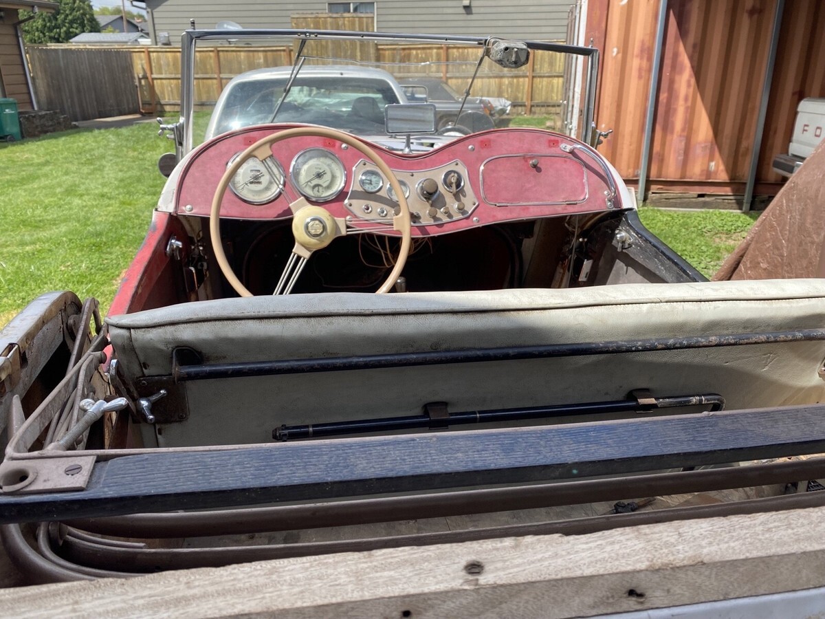 Original TD. Nice project. Body is rust free, except for some light corrosion from Oregon humidity. Original white paint. All wood is solid. Very complete. Nice red vinyl and leather interior (not installed). New steering wheel. New mirrors. New windscreen glass. Gauges in great condition. Nice radiator. New ignition key. Nice side curtains. Zero miles on Rebuilt gearbox. Car needs paint, top fabric, and rechroming. Paint on body looks to be original. Frame is painted black.