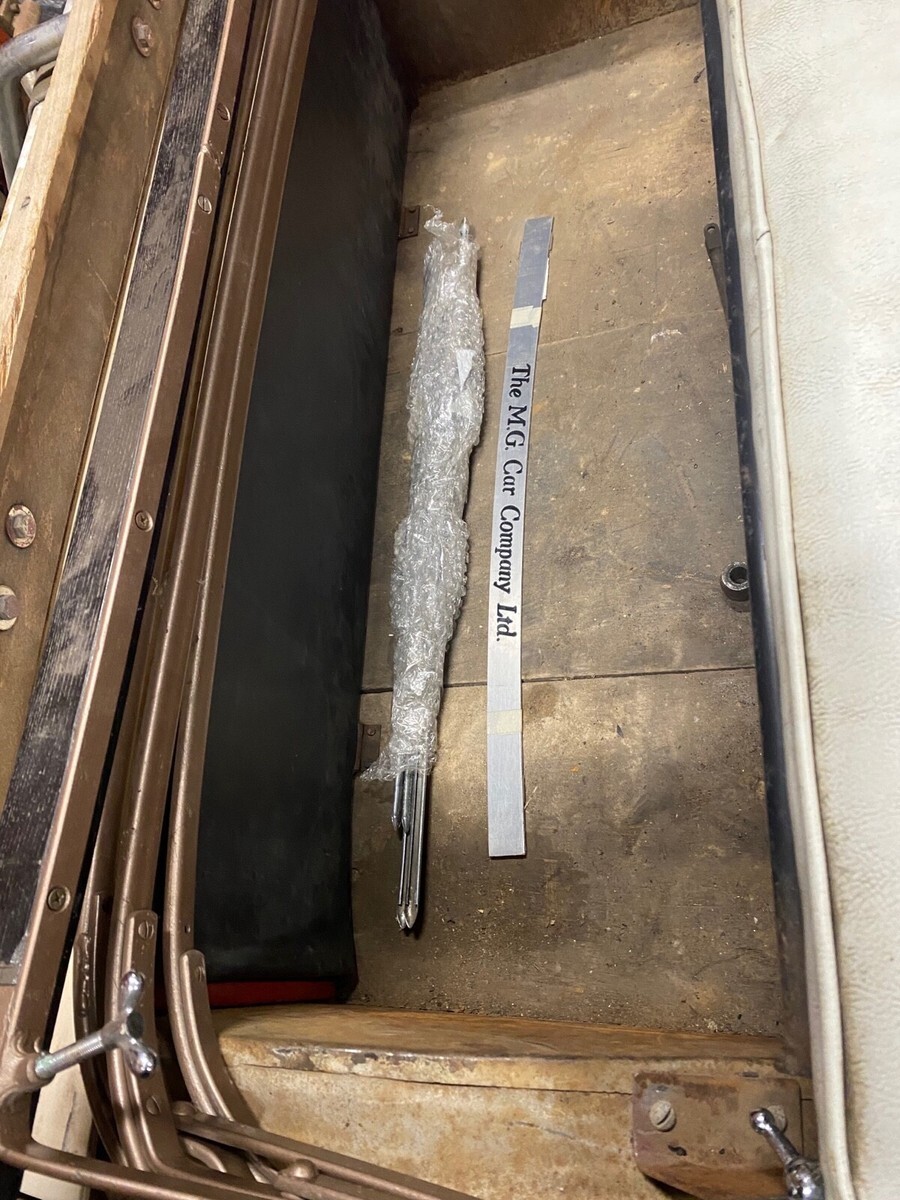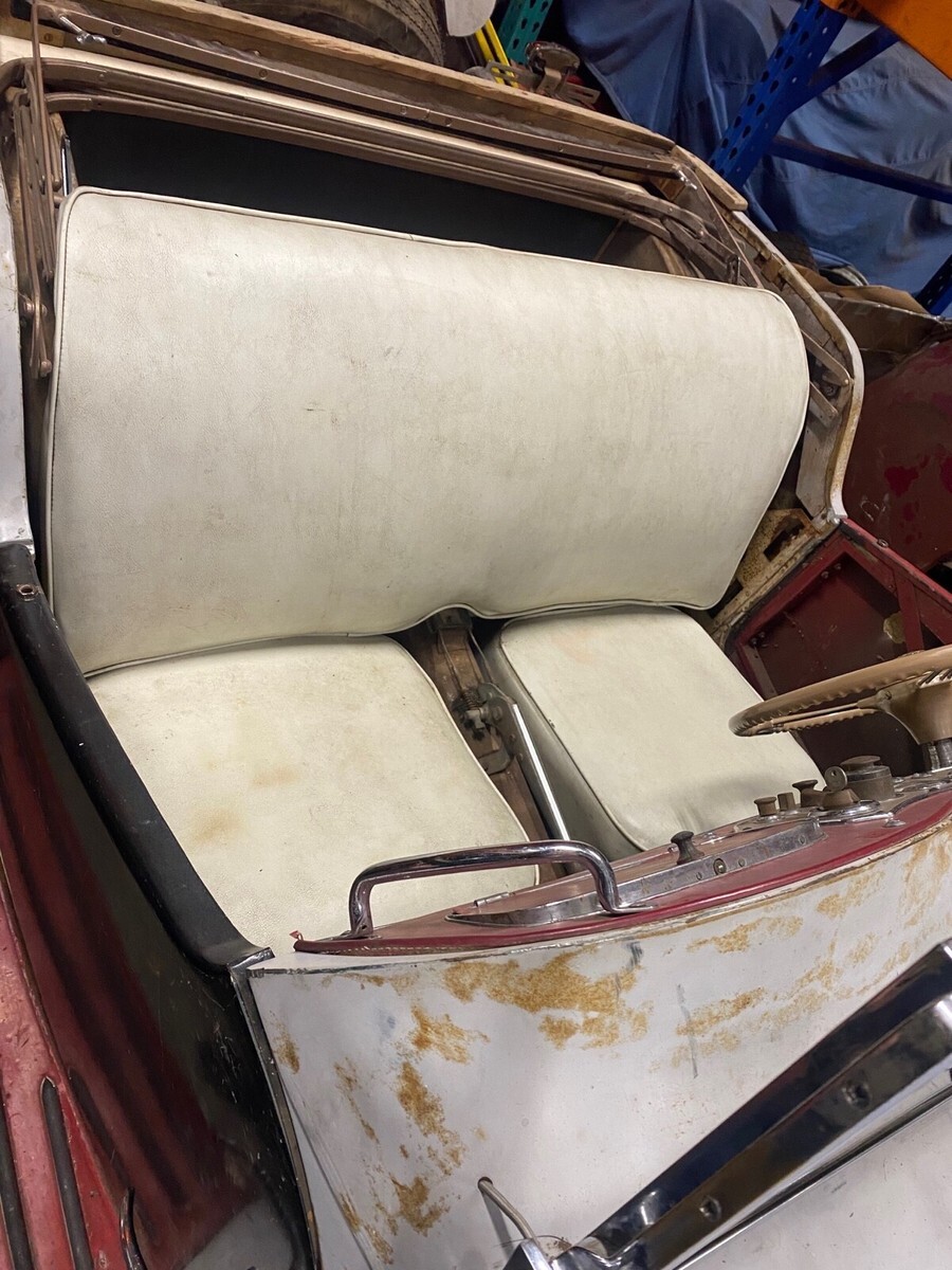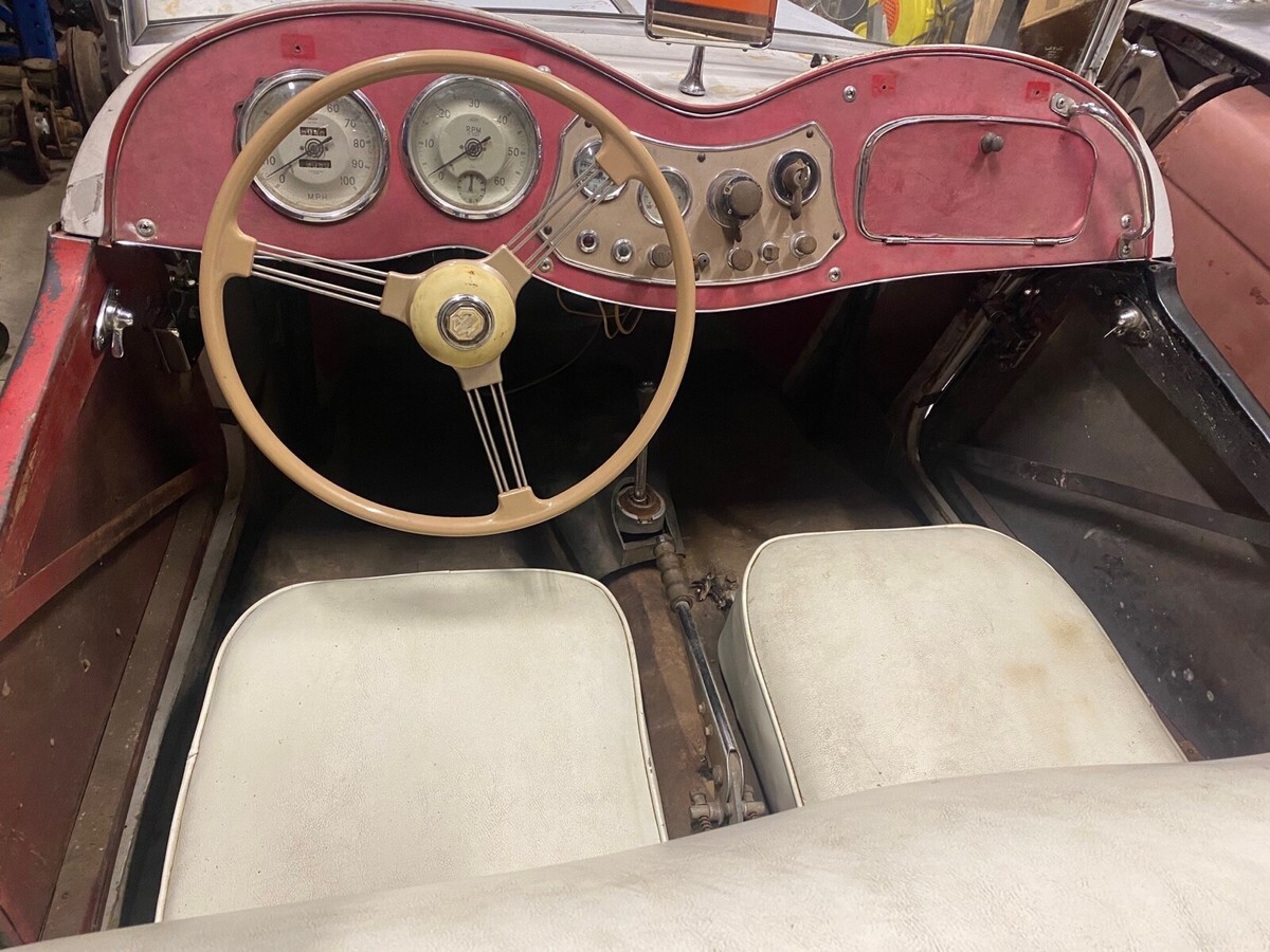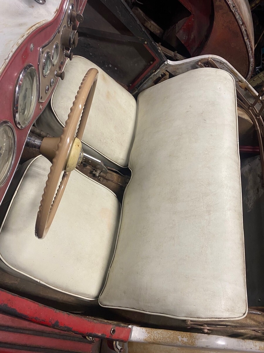 Original TD. Nice project. Body is rust free, except for some light corrosion from Oregon humidity. Original white paint. All wood is solid. Very complete. Nice red vinyl and leather interior (not installed). New steering wheel. New mirrors. New windscreen glass. Gauges in great condition. Nice radiator. New ignition key. Nice side curtains. Zero miles on Rebuilt gearbox. Car needs paint, top fabric, and rechroming. Paint on body looks to be original. Frame is painted black.