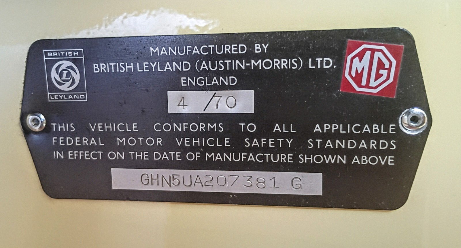 The chassis number GHN5UA207381G identifies a 1970 MG B Roadster that was produced for the North American market. The code breaks down as follows:G: MGH: B-Series engineN: Two-seater roadster5: 1970 model yearU: U.S.A. destinationA: Abingdon assembly plant207381G: Sequential production number.Key features of the 1970 MG BChrome bumpers: The 1970 model year was part of the "chrome bumper" era (1963-1974), which is generally considered the most desirable for collectors.Engine: Like all MGBs, it is powered by a reliable 1.8-liter, inline four-cylinder engine.Transmission: The car came with a four-speed manual transmission.Driving experience: These cars are known for being strong, fun drivers with good handling.