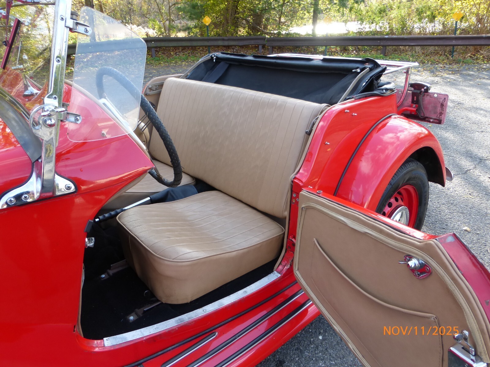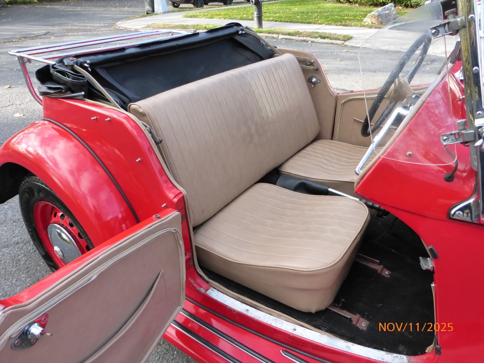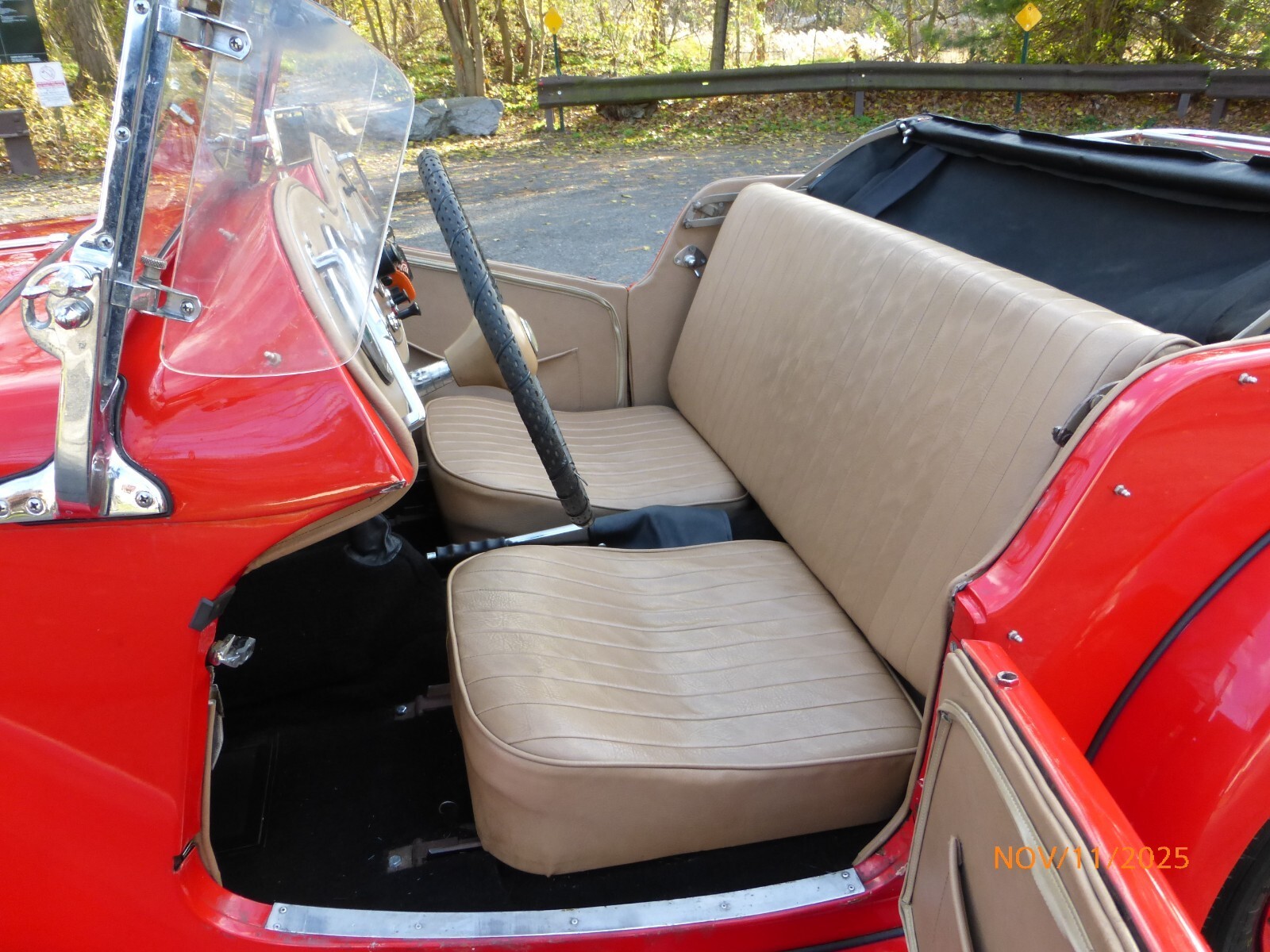 1950 MGTD that is ready to be enjoyed. The car is in brilliant red with a tan interior and it has a black convertible top. It is nicely presentable all around. Paint is in good condition with a deep luster. Chrome is nice and shiny. Interior is good condition – seats are intact and the carpet is decent. Mechanics are in good working order. Engine is original and still has the original cleaner assembly. It runs smooth with good compression (140+). Transmission, clutch and brakes are working well. Recent work includes new exhaust and new tires. Underside is clean – the frame appears to be solid. Convertible top is new. Side windows are old and are largely the frames only. Car comes with a foot mats, spare wheel, jack and tonneau cover (black). This is a very original TD with the headlights and parking lights showing original emblems, and could be a nice addition to a budding collection.More pictures and videos are available on our website. Visit us at Merit Cars.