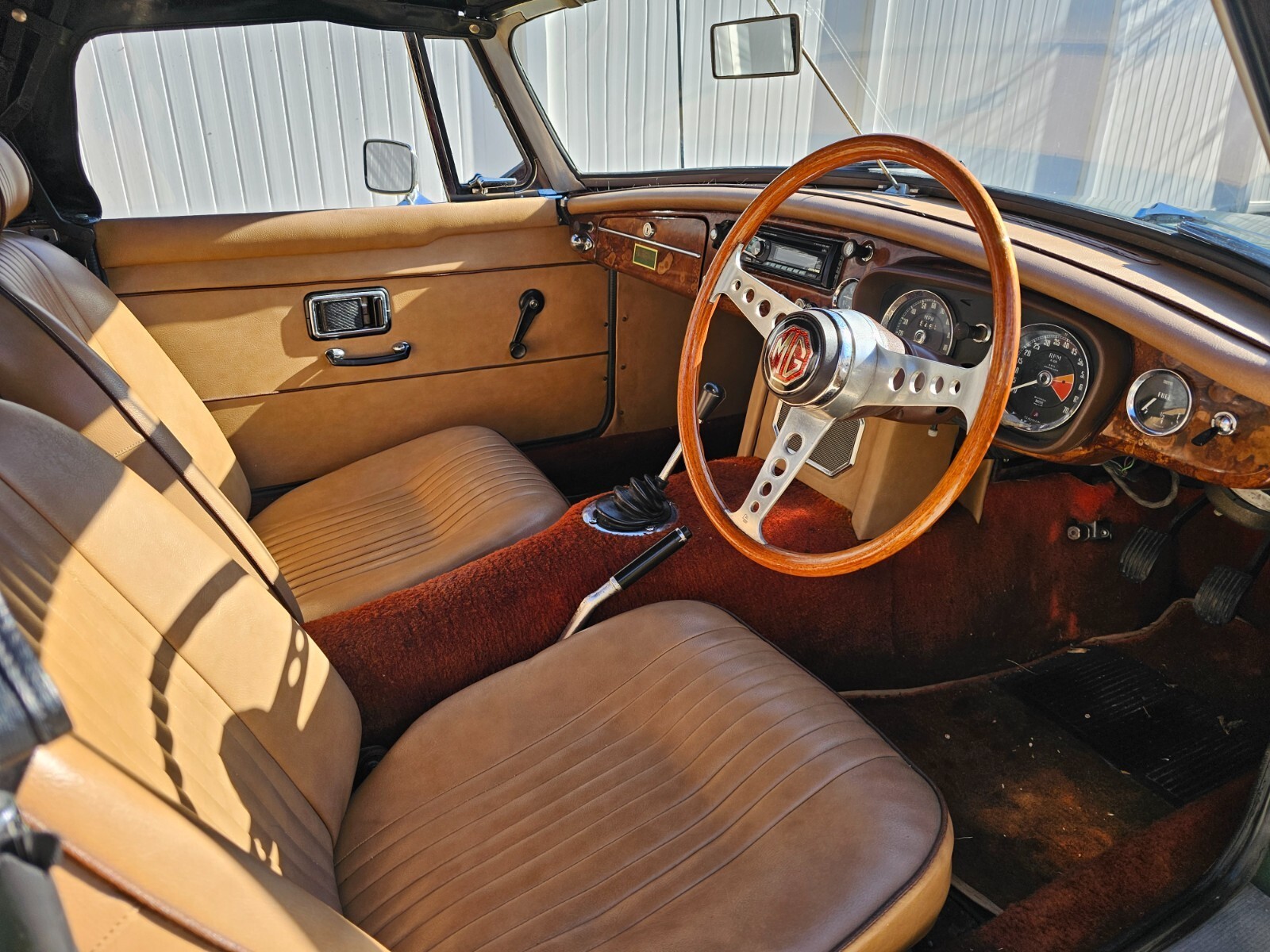 A rare Cayman Islands–spec, right-hand-drive 1969 MGB featuring a steel dashboard, early-style interior details, and a highly desirable Les Leston steering wheel.