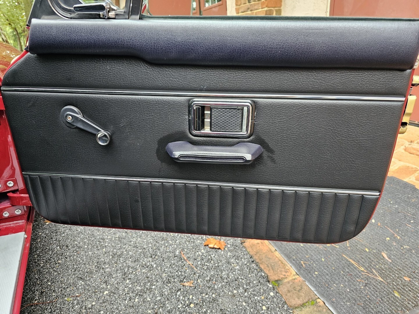 The car was treated to a rotisserie restoration, and the attention to detail shows throughout. The paintwork and panel fit are excellent—near show quality. During the restoration, new rocker panels were installed before the car was refinished in its current rich red exterior color in 2023. The car rides on 14″ Rostyle wheels wrapped in 175/70 Firestone FR680 tires.