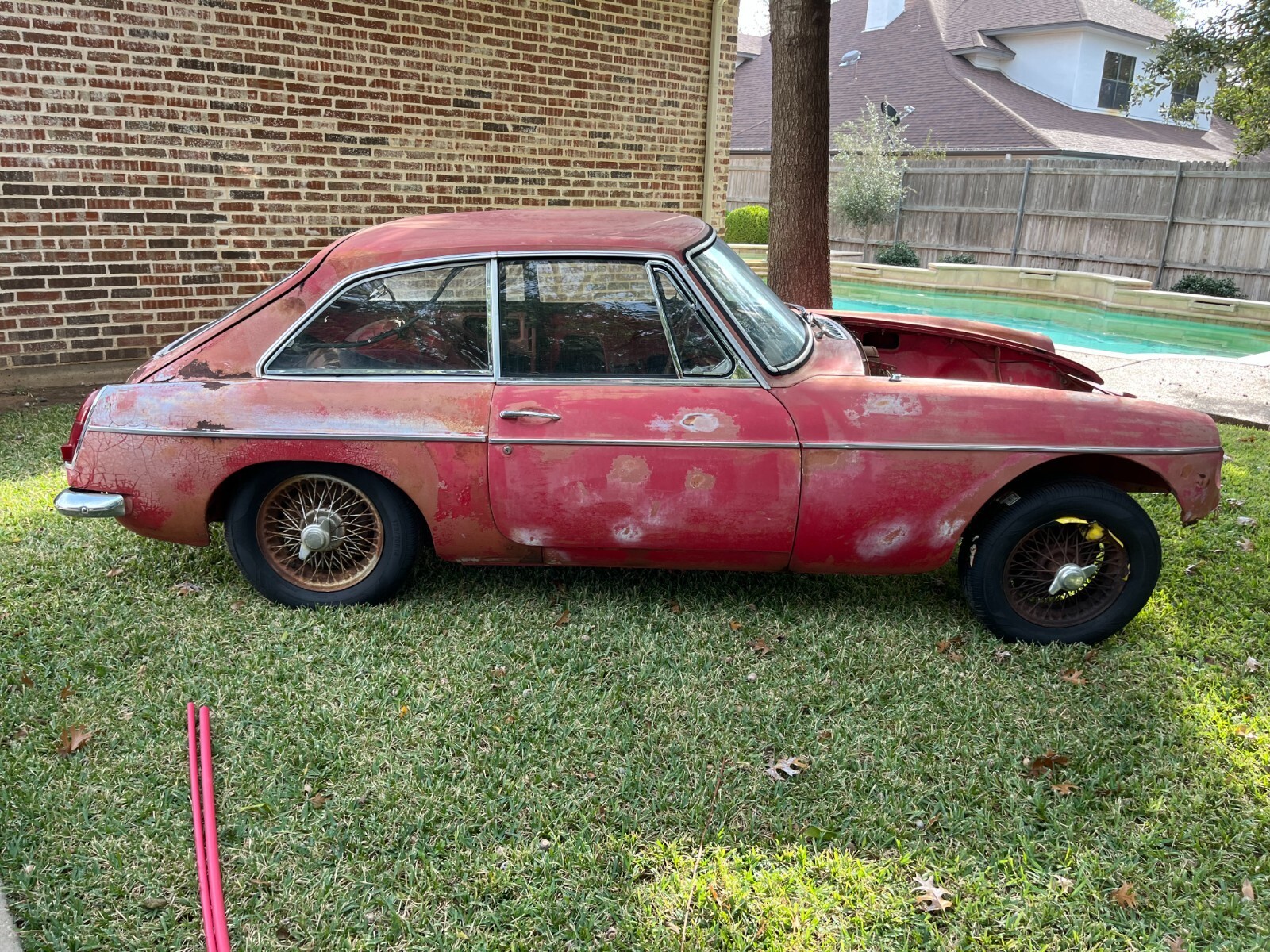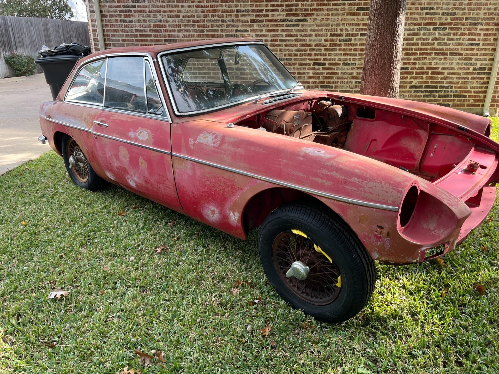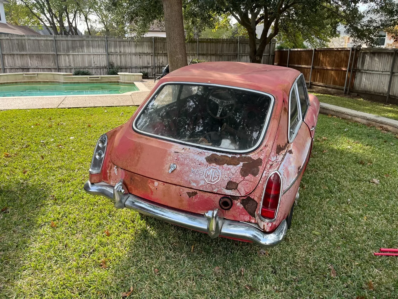 1967 MGBGT for project or parts. Mostly solid body with rust on rear quarter by the window and previous collision damage (some filler) on the rear hatchback. Hood is in good shape (not pictured) Roof is solid but is pushed in. I have a freshly rebuilt 1.8L engine (long block) to go with this car. Not included in the price but available if you need it. I also have a 4 speed transmission. No interior.