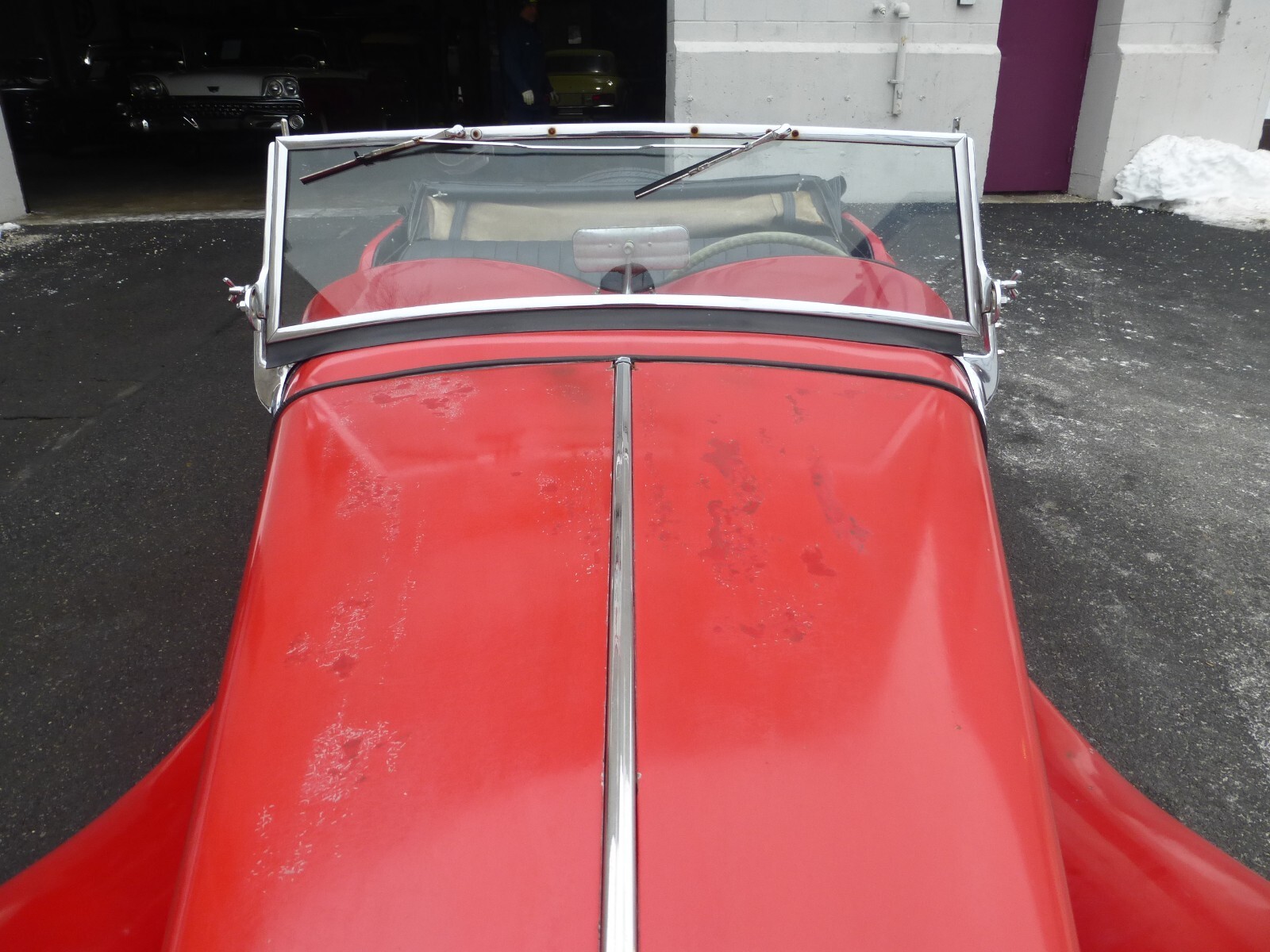 Finished in red with black interior and black convertible top. The car shows signs of an older quality restoration. Paint presents well overall but shows age with chips and sunbaking. Chrome is good. Interior is decent and clean.