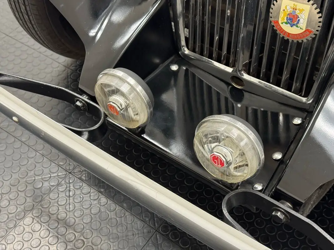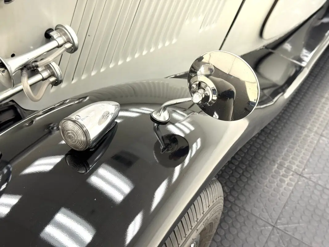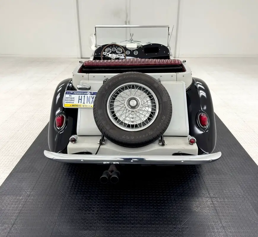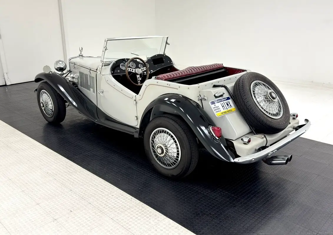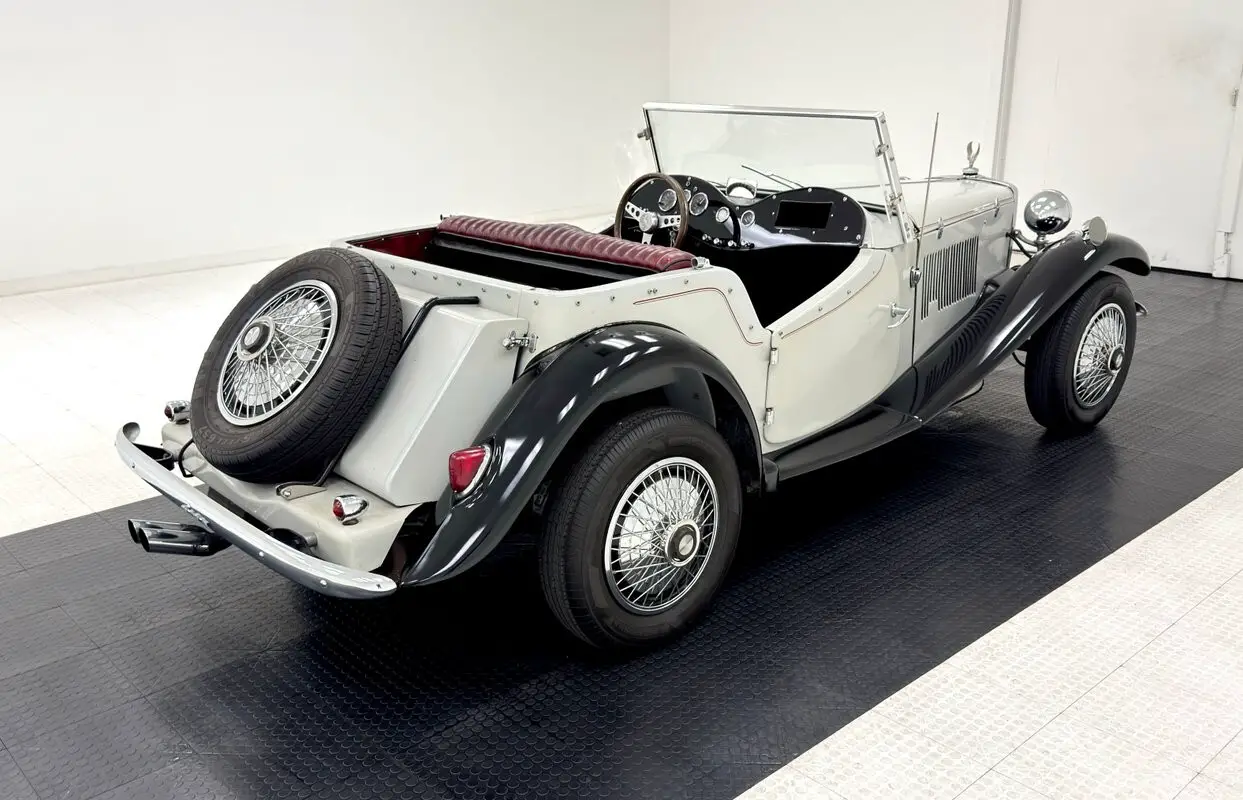The gray body is nicely offset by the contrasting black fenders connected by a running board and framing the cabin with style. There's a lot going on in the front with symmetrical headlights flanking the vertical bars of the grille, a chrome grille shell, side mirrors posted on the fenders, an eagle ornament on the radiator cap, (which is actually a gas cap, more on that soon), and fog lights on the front apron. This of course is underscored by the chrome bumper and it's all convincingly MG. 15-inch wire wheel covers dress up the 165/80R15's and diminutive tail lights mimic those of the real deal, while twin exhaust tips, large for an MG, will cause those pondering authenticity to pause. Imperfections are minimal and include some brightwork that is less than pristine and a chip in the fiberglass near a hinge.