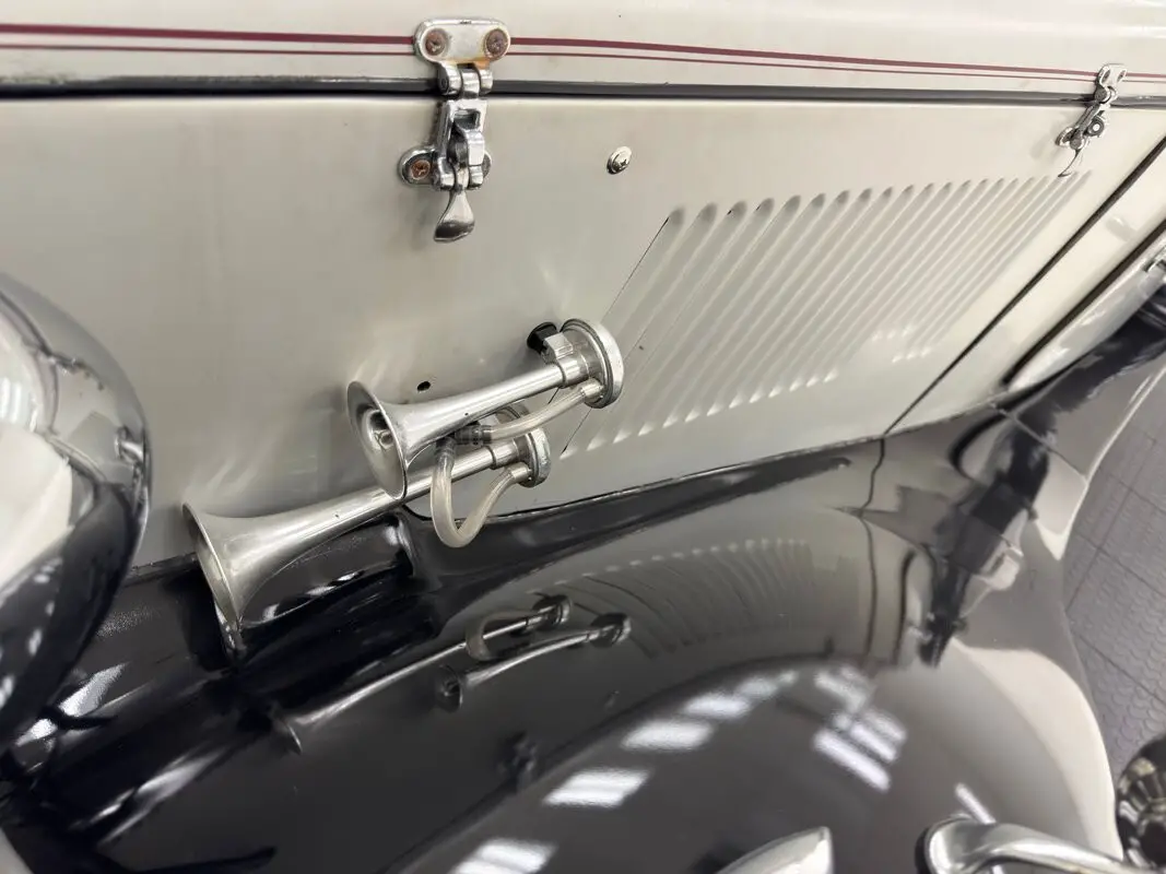 Marbleized Oxblood vinyl is used as the interior palette with the door panels that include large map pockets with padded, stitched design, and the door appropriately open suicide style. The column tufted seats are of the same red material and are adorned with black piping and it's in great condition. The red liners in the package area show some wear, but its black carpet floor appears nice. A smaller than original wood rimmed steering wheel with sporty spokes fronts a piano black dashboard faceplate housing VDO gauges which blend with black, and a glovebox that is a doorless cove cut from the black plate. A wood handles shifter rises from the floor wearing a rubber boot over a nice black carpet. Under the hood is not the engine, but the battery, a gas tank, and of course, the steering linkage.