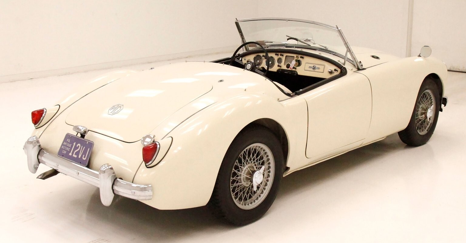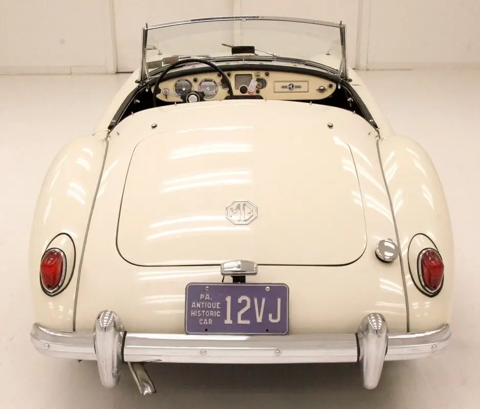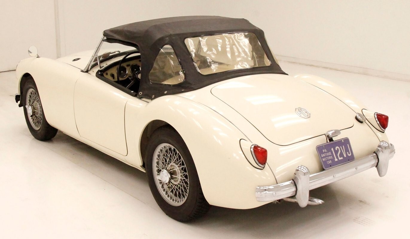 The MGA was a big step forward for the British automaker and somewhat shocking to MG fans around the globe. With its persuasive yet delicate flowing lines all bathed in an older application of Old English White that is retaining its shine with just minor scratches and areas of rub off on the seams. Starting up front, the raked back waterfall style grille which melts its way into the rounded peak fenders with their chrome bezel headlights. Just below this steel and chrome artwork is a clean bumper with added bumperettes. Moving down the sides, a swooping body line melts into the highly arched rear fenders creating a soft vee shape that keeps eyes drawn and hearts pounding. These sides, devoid of all chrome and trimmings, achieve artistic perfection with the sculpted lines as they frame the knockoff hub wire spoke wheels and black wall rubber. Just aft of the long bonnet is a chromed windscreen framed with a black vinyl convertible top with clear plastic windows and additional side curtains are present and accounted for in case you hit a spot of inclement weather. On the back is the rear curved bumper stretching from fender to fender with its near perfect bumperettes, oval tail lights, and a chrome octagonal MG badge in the center of the boot lid.