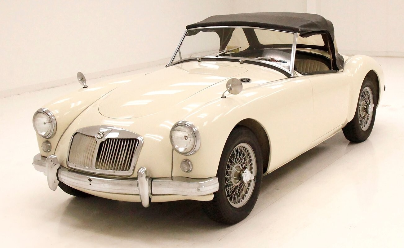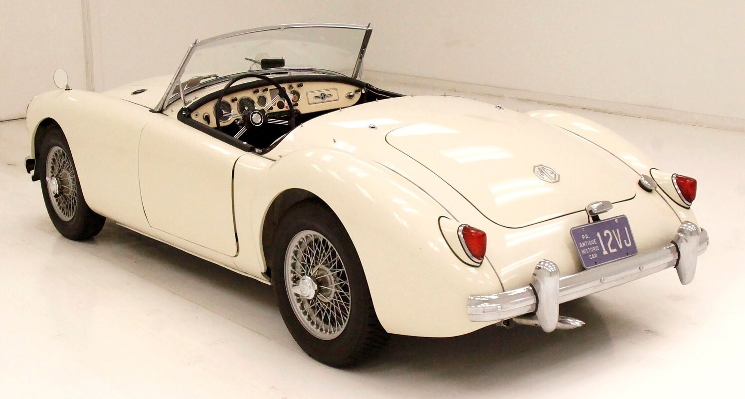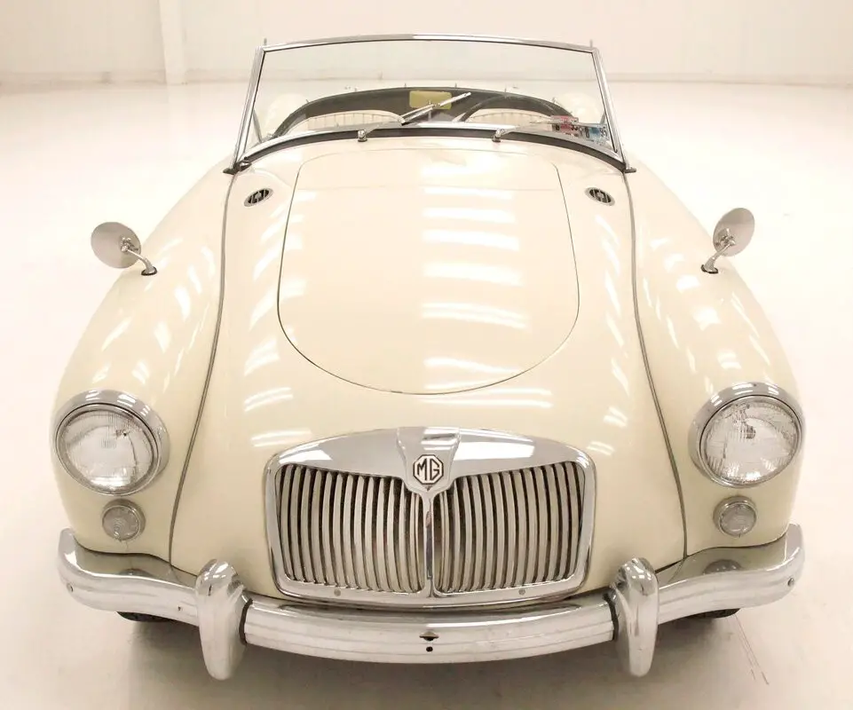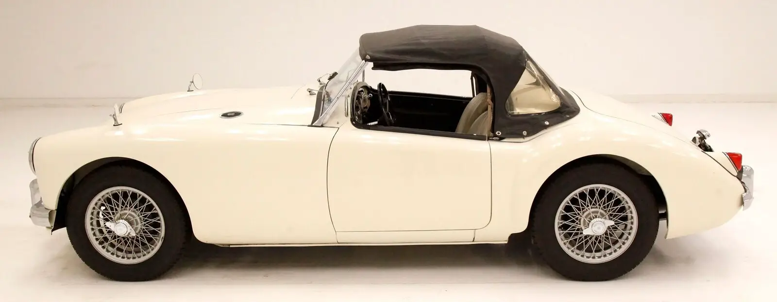 The MGA was a big step forward for the British automaker and somewhat shocking to MG fans around the globe. With its persuasive yet delicate flowing lines all bathed in an older application of Old English White that is retaining its shine with just minor scratches and areas of rub off on the seams. Starting up front, the raked back waterfall style grille which melts its way into the rounded peak fenders with their chrome bezel headlights. Just below this steel and chrome artwork is a clean bumper with added bumperettes. Moving down the sides, a swooping body line melts into the highly arched rear fenders creating a soft vee shape that keeps eyes drawn and hearts pounding. These sides, devoid of all chrome and trimmings, achieve artistic perfection with the sculpted lines as they frame the knockoff hub wire spoke wheels and black wall rubber. Just aft of the long bonnet is a chromed windscreen framed with a black vinyl convertible top with clear plastic windows and additional side curtains are present and accounted for in case you hit a spot of inclement weather. On the back is the rear curved bumper stretching from fender to fender with its near perfect bumperettes, oval tail lights, and a chrome octagonal MG badge in the center of the boot lid.