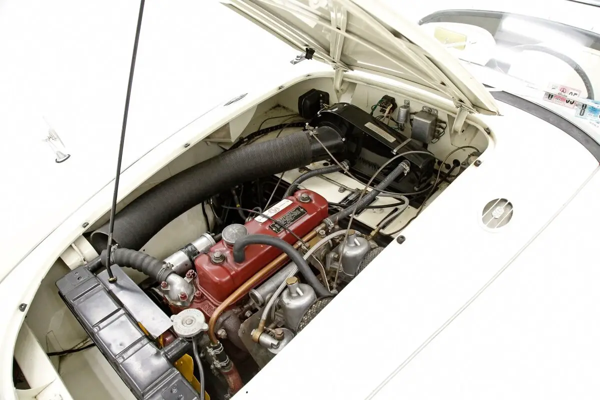 A flip of the long swooping hood reveals a nicely restored 4-cylinder red painted engine block in 1489cc configuration. This mill is fed by 2 SU's which are semi downdraft carburetors. There is a 4-speed manual transmission attached to the back and a 4.30 rear axle way in back. The engine bay is very well done with just a light dust coating of patina.