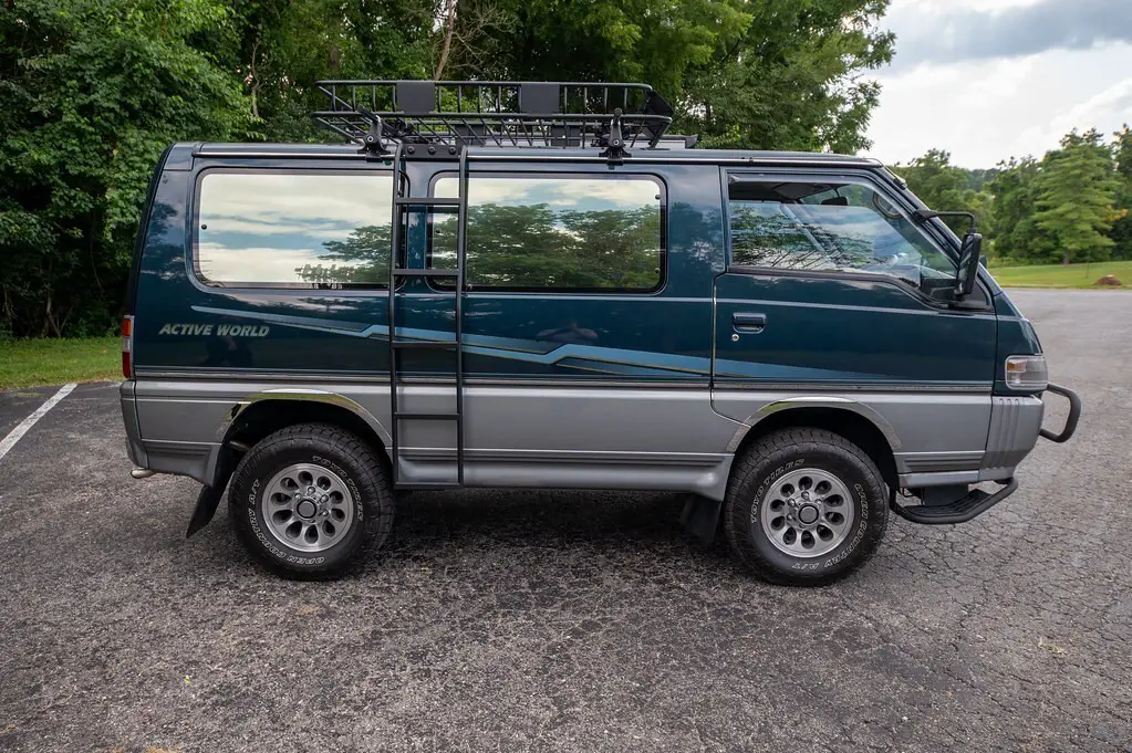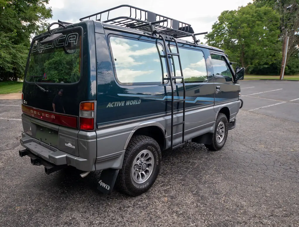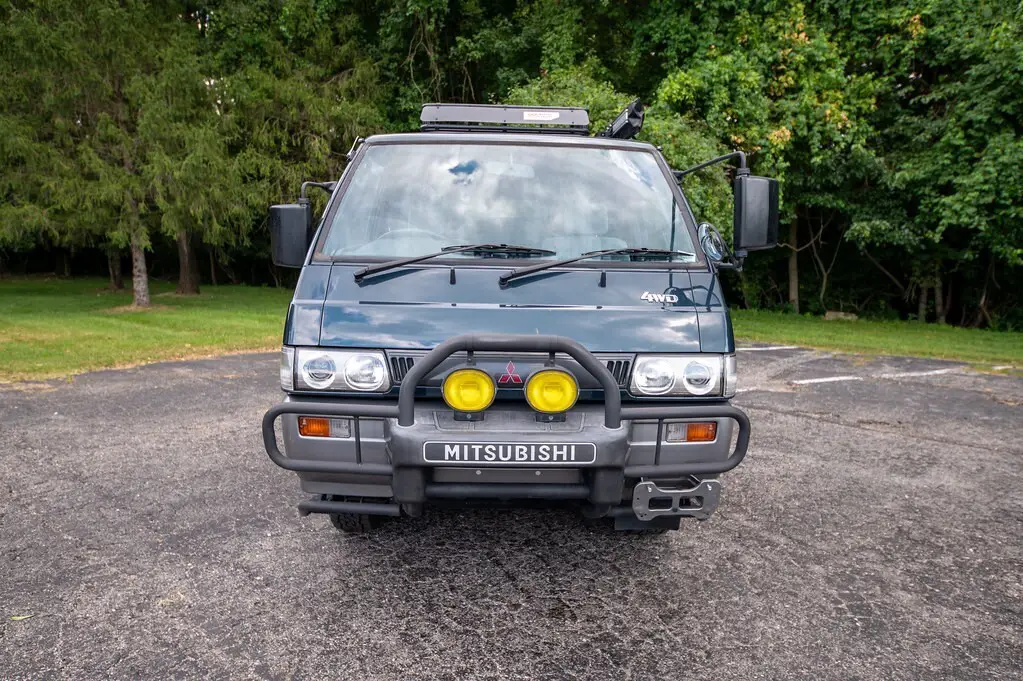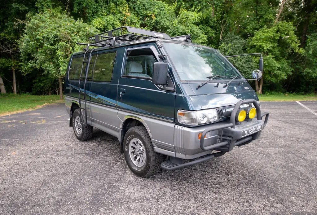 Emerald Green 1991 Mitsubishi Delica Star Wagon Active World is a right-hand drive, Japanese- Market van that's titled in Missouri. It's equipped with a metric instrument cluster and its odometer displays about 152,000 kilometers which represents about 96,000 miles. Factory equipment includes 16-inch wheels, a brush guard, side steps, cloth upholstery, swiveling second-row seats, folding third-row seats, a cool box, and air conditioning. Power comes from a 2.5-liter turbodiesel 4-cylinder engine rated at about 86 horsepower and 148 lb-ft of torque. Called 4D56 internall, it spins the rear of the four wheels via a 4-speed automatic transmission and a 2-speed transfer case. Modifications include an engine block heater, door edge guards, tinted windows, aftermarket touch screen with rear camera. This would make a great vehicle for a colleter to be registered as a historic vehicle.