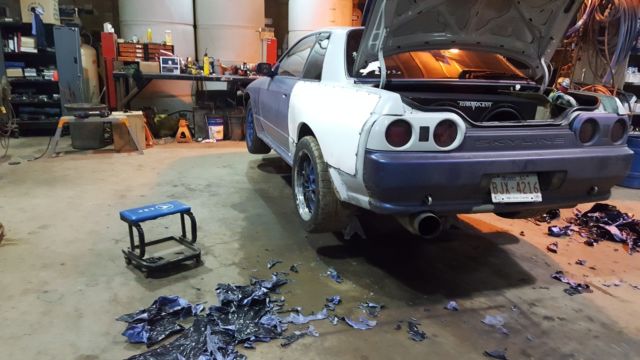 White with wide-body over fenders. When the fenders were cut but the previous owner they weren't sealed and finished properly. The car needs the rear quarters finished either flares, widebody, or back to oem quarters(tons of options) The car needs some body work and paint but mechanically the car is great. The car was tuned at a reputable shop in Calgary, Ab a few years back with dyno sheet and receipts in a folder.