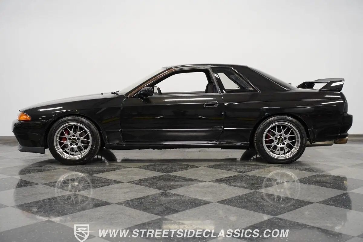 Iconic Japanese engineering meets motorsport legacy in this 1992 Nissan Skyline GT-R R32, finished in a gleaming metallic black that accentuates its purposeful lines and aggressive stance. Known by enthusiasts worldwide as "Godzilla," this legendary machine's sleek coupe silhouette features a full black repaint that complements its performance-oriented aerodynamic profile. The upgraded 17" forged BBS wheels elevate its visual impact and handling prowess, wrapped in 245/45/17 Bridgestone tires for optimal grip. The factory body styling with its subtle rear wing and functional front air dam creates the perfect canvas for this technological tour de force, completing a package that defined an era of Japanese performance.