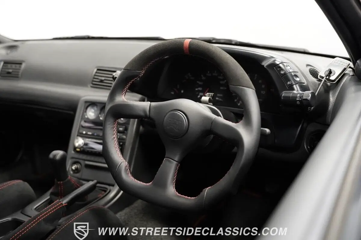 Inside the cabin, a driver-centric layout welcomes with black cloth bucket seats re-trimmed in gray and black suede that hold occupants firmly in place during spirited driving. The matching black leather steering wheel with coordinating gray and black accents continues the performance theme, while the factory gauge cluster provides vital information with classic JDM flair. Modern amenities include an aftermarket AM/FM/AUX stereo head unit, complemented by factory air conditioning and power steering for daily comfort. The matching rear seats, clean carpeting, and black floor mats maintain the period-correct aesthetic while adding thoughtful touches to this well-preserved interior.