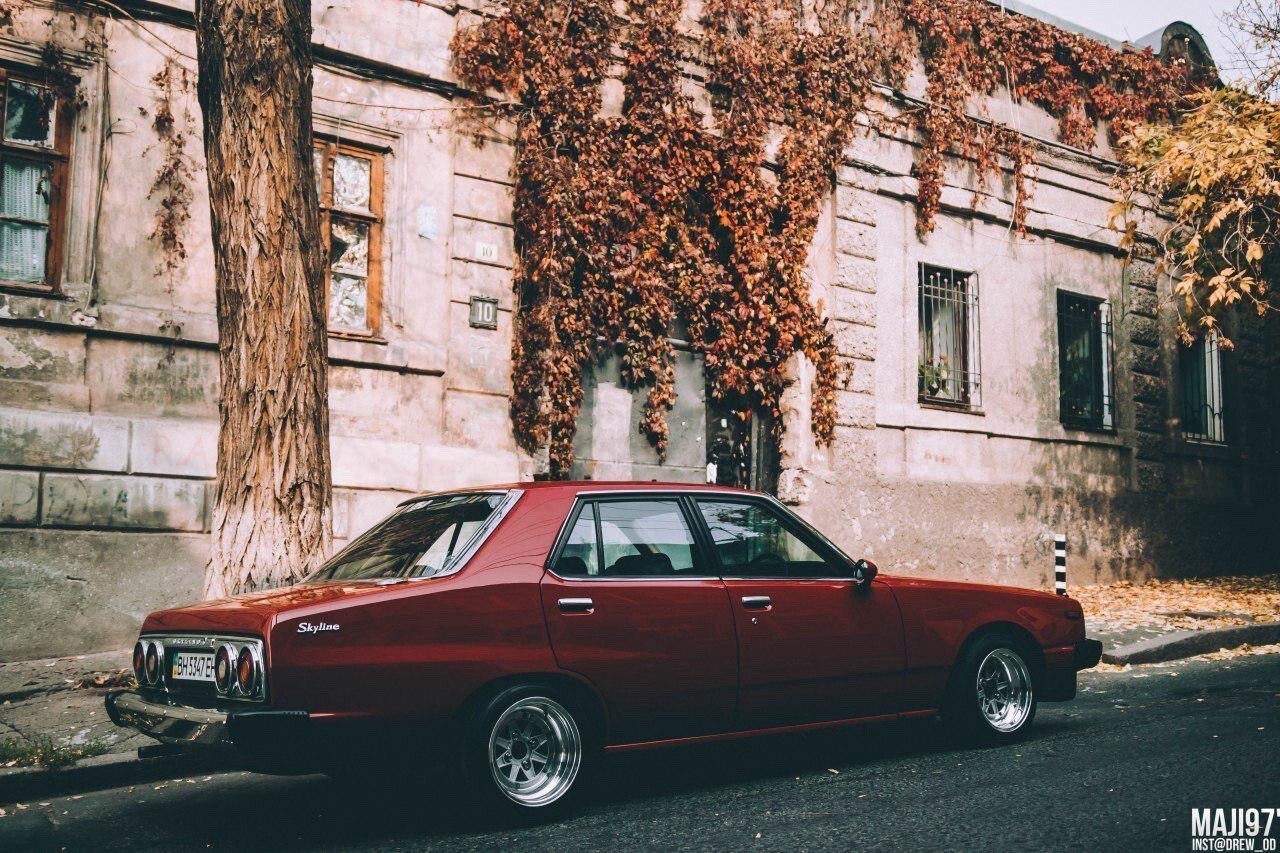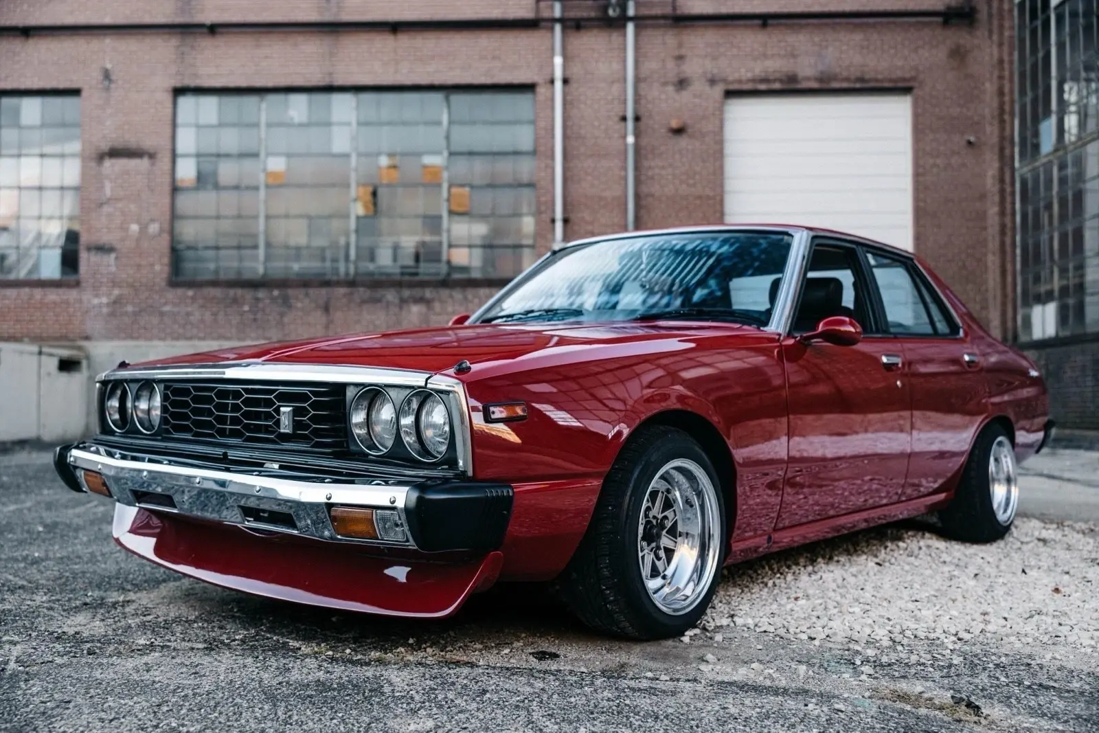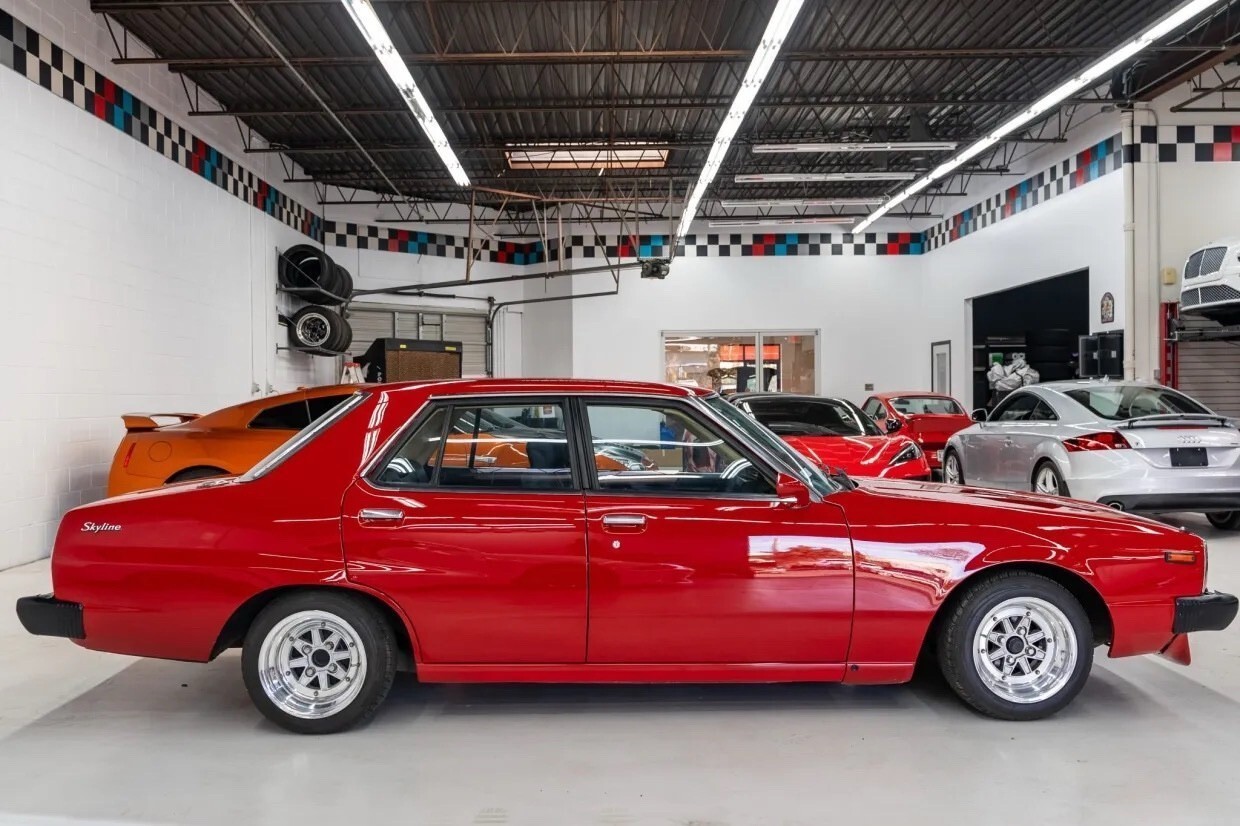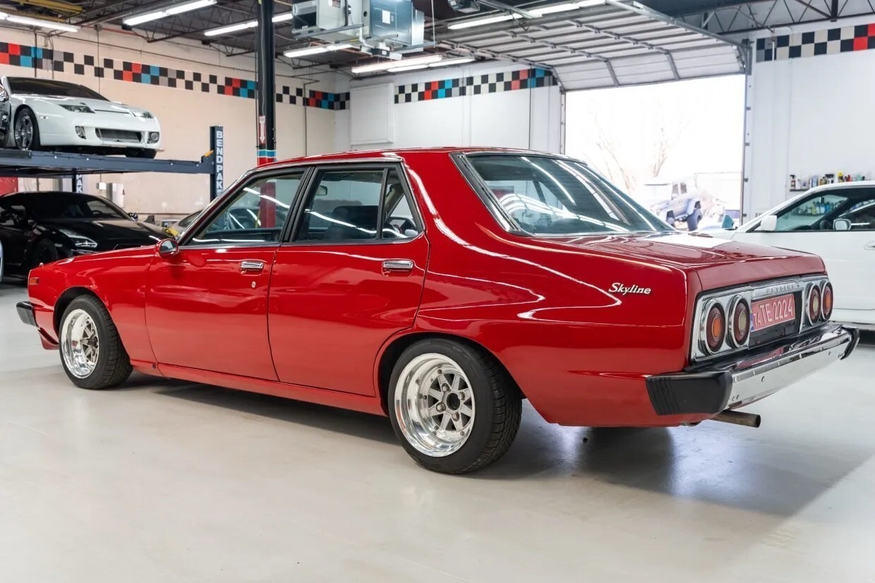 Finished in red over black leather, the sedan is powered by a 2.0-liter L20E inline-six mated to a three-speed automatic transmission. It rides on 14″ Speed Star multi-piece wheels and is further equipped with front disc brakes, a front spoiler, air conditioning, power windows, a MOMO steering wheel, and an Alpine CD stereo with Bluetooth capability. This C210 Skyline is now offered with a clean Missouri title. 1979 Nissan Skyline 2000GT-EL The fifth-generation Skyline was introduced in 1977 and produced in multiple body styles through 1981. This sedan is said to have undergone rust repairs prior to being refinished in red in the late-2010s. Exterior details include quadruple headlights, a front spoiler, power-adjustable side mirrors, and a chrome-finished tail panel. 1979 Nissan Skyline 2000GT-EL Speed Star 14″ multi-piece wheels are mounted with 185/55 Kormoran Runpro tires. It rides on negative-camber suspension, and stopping power is provided by front discs and rear drum brakes. 1979 Nissan Skyline 2000GT-EL The right-hand-drive cabin houses front bucket seats with retractable headrests trimmed in black leather that extends to the rear bench and door panels. Additional appointments include power windows, air conditioning, and a Bluetooth-capable Alpine CD stereo linked with a Focal subwoofer and amplifier. 1979 Nissan Skyline 2000GT-EL The MOMO steering wheel is trimmed in black leather and fronts a 180-km/h speedometer, an 8k-rpm tachometer, and a Quartz digital clock, as well as auxiliary gauges monitoring fuel level, voltage, oil pressure, coolant temperature, and boost. The five-digit odometer shows 46k kilometers (~29k miles), a handful of which were added under current ownership. 1979 Nissan Skyline 2000GT-EL The 2.0-liter L20E inline-six is equipped with fuel injection and was factory rated at approximately 130 horsepower. 1979 Nissan Skyline 2000GT-EL Power is sent to the rear wheels through a three-speed automatic transmission.
