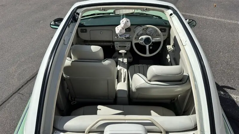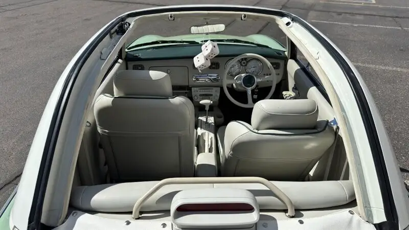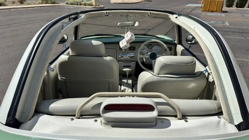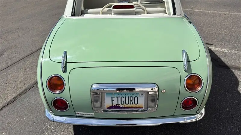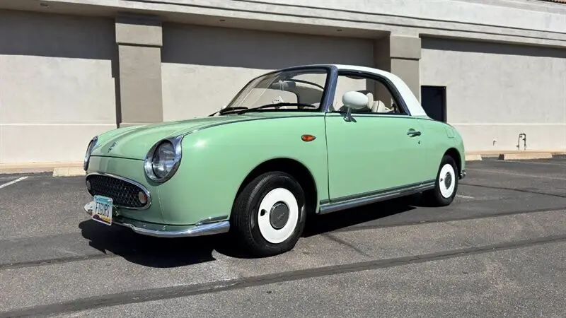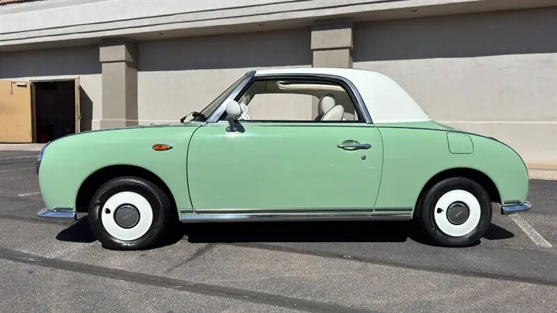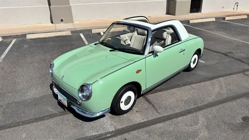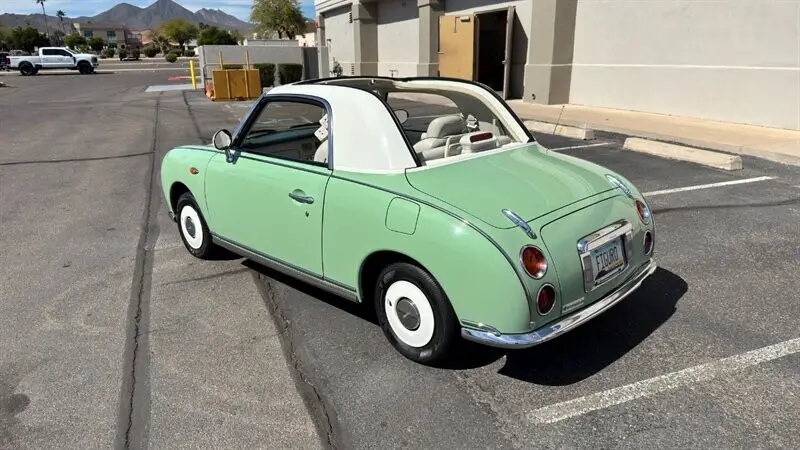 The 1991 Nissan Figaro is a triumph of retro-futurist design, born from Nissan's legendary "Pike Factory" special projects division. Designed to evoke the romantic elegance of 1950s European microcars, the Figaro was built exclusively for the Japanese Domestic Market and limited to a single year of production. It is a boutique city car that captures hearts wherever it goes, offering an injection of pure joy and vintage charm without the mechanical headaches of a true mid-century classic. Today, it stands as a highly sought-after cult classic for collectors who appreciate automotive art. Beneath the delightfully nostalgic bodywork lies the proven, reliable engineering of a 1990s Nissan. Power comes from a peppy 1.0-liter turbocharged four-cylinder engine mated to a smooth-shifting 3-speed automatic transmission. This lightweight, front-wheel-drive configuration makes it exceptionally nimble around town and an absolute pleasure to drive. It delivers a modern, turn-key experience, ensuring that your weekend cruises are spent on the road rather than in the garage. The example offered here is finished in Emerald Green--one of the four exclusive factory colors chosen to represent the four seasons, specifically denoting "Spring." The exterior presentation is described as near perfect, highlighting the careful preservation it has enjoyed under dedicated collector ownership. The iconic profile is crowned by a white retractable fabric top that remains in like-new condition, allowing you to easily roll back the roof for an open-air, fixed-profile convertible experience. Inside, the cabin is a beautifully executed continuation of the retro theme, featuring white upholstery, chrome toggle switches, and a distinctively vintage instrument cluster. The interior remains in great condition, showing only minor, expected wear on the driver's seat that is perfectly commensurate with its low 44,000 miles of use. To make modern cruising more enjoyable, a Bluetooth stereo has been thoughtfully added, blending seamless smartphone connectivity with the car's classic aesthetic. For market context, Hagerty currently places the valuation for a pristine #1 condition Figaro at $46,400, with an excellent #2 condition example valued at $30,700. Because this meticulously preserved, collector-owned example presents beautifully between a #1 and #2 condition, the asking price directly reflects its true market position and potential insured value through Hagerty. This is a rare, low-mileage piece of JDM history ready to charm its next caretaker.