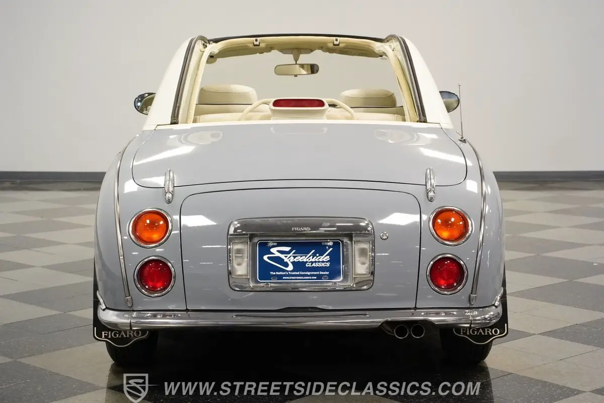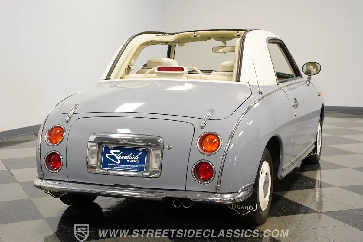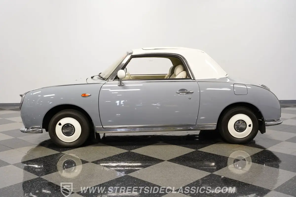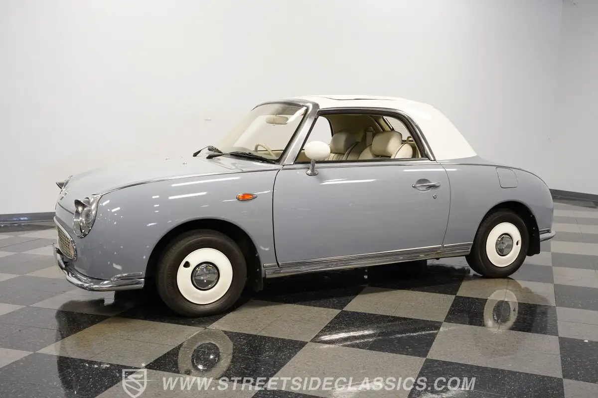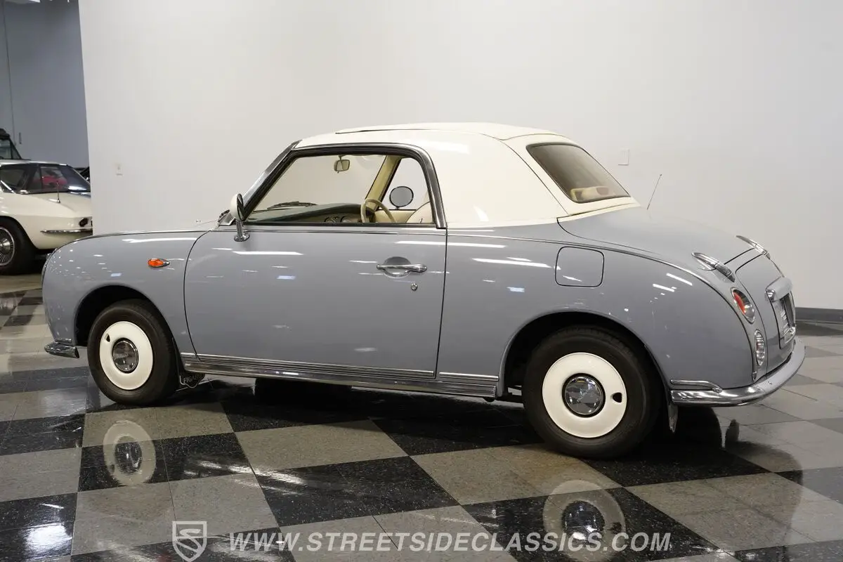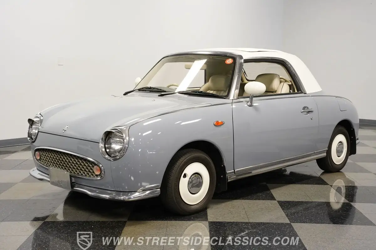 Among the rarest Japanese imports, this 1991 Nissan Figaro Convertible is finished in Lapis Grey. The compact proportions showcase Japanese design innovation that still looks fresh today. Its white canvas convertible top folds down for open-air enjoyment while maintaining the glass rear window for visibility. The clean lines follow a distinct approach to small car styling that stands apart from typical offerings. Rolling on 12-inch wheels with 165/70R12 tires, this Figaro maintains its authentic Japanese specifications.