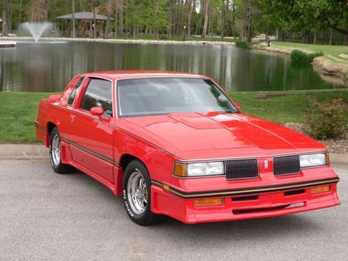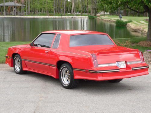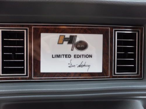 This is a 1988 Oldsmobile 20th Anniversary Hurst/Olds Aero Commemorative. In 1988 Hurst did not deal directly to convert Oldsmobiles with General Motors. Instead you were offered this special aero kit which included the ground effects with rear spoiler, special black and gold striping, and Hurst/Olds name badges. Most kits were sold and never registered. The only way they could be registered is if you installed them on a 1988 Cutlass. No other year car could be registered with Doc Watson at Hurst. When you registered it, you sent in your VIN and then Doc Watson would send you back a special silver decal for you car with your car number on it. This car is #64. I have yet to see a higher number. Some cars were sent to Hurst for conversion where Doc Watson would install your kit for a fee.Others were converted by their owners which is what happened in this case. With the flexibility to do almost whatever you wanted as long as you registered it and used the aero kit, you were very free to build your Hurst/Olds about any way you wanted, hence the color red which my dad is partial to. It will probably be the only red Hurst/Olds ever built.