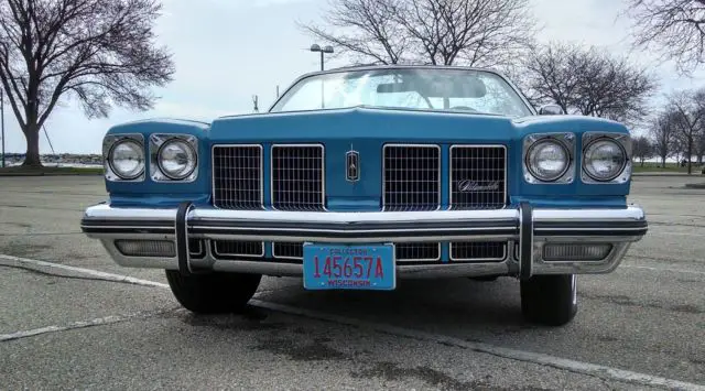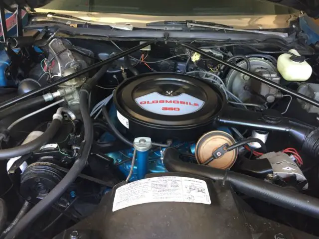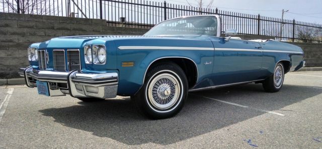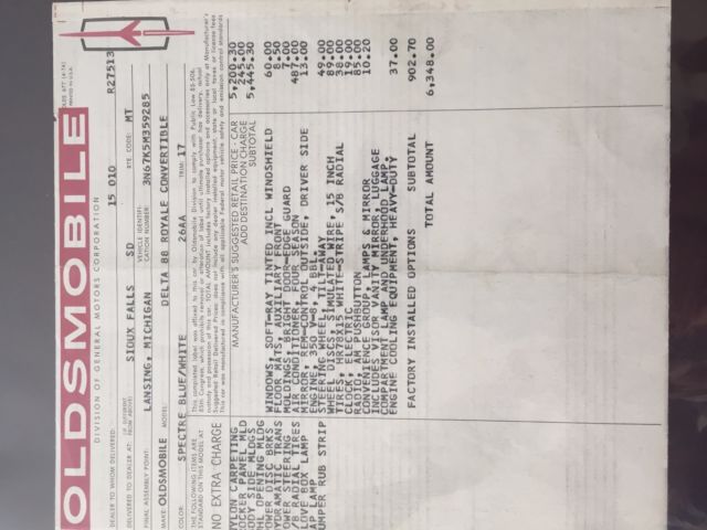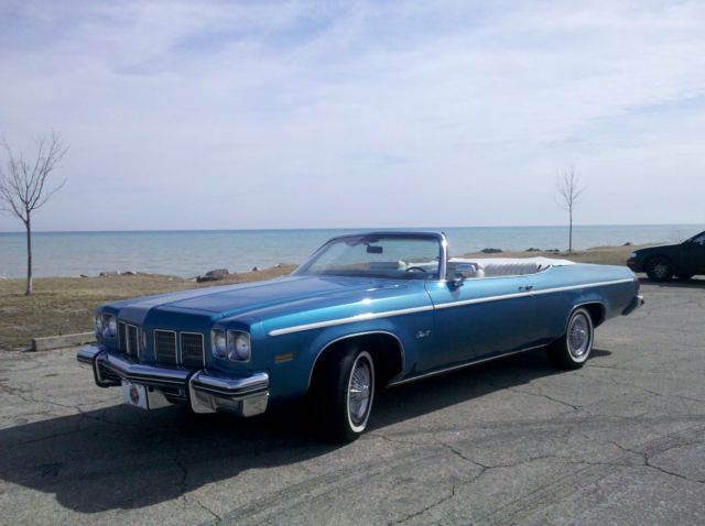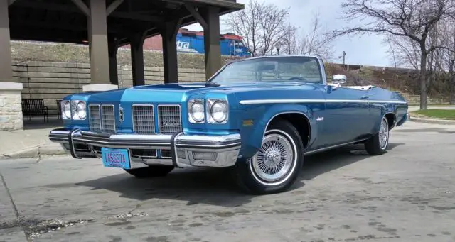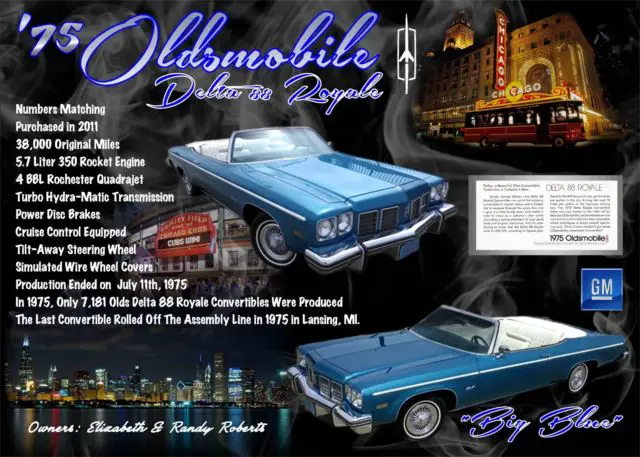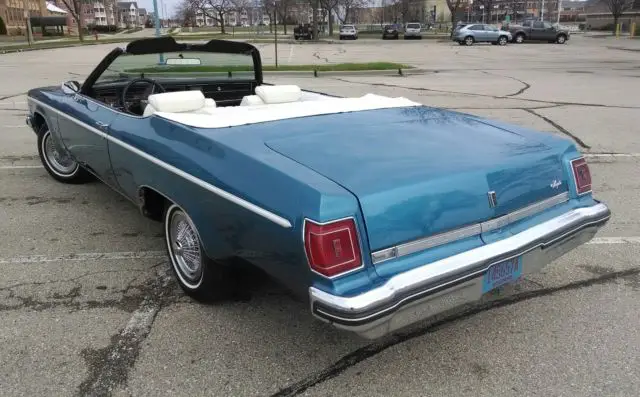 1975 Oldsmobile Delta 88 Royale 2-Dr. Convertible, Spectre Blue/White in color: 43,088 original miles; NO rust; ALL original; matching numbers; A/C blows cold; all sound mechanicals, and runs like a boat over smooth water! Tires new with approximately 3,000mi wear. Engine pulled and completely detailed. Interior VERY clean; new carpet and sill plates.