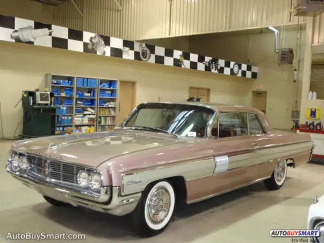 This car is an un-restored car with its original interior and loaded with options. an ultra high compression Starfire 394cid V8 producing 345hp and mated to a 4-speed Hydra-Matic transmission. Features include power steering, power brakes, power windows and power seat. Car also has rare factory air conditioning, leather bucket seats, full length console with tachometer, speed minder and power antenna. The color is its original Sunset Mist with complimenting two tone interior, correct wide white wall tires and color keyed deluxe wheel covers. Trunk is complete with original spare and jack and has correct trunk trim.