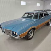 1972 OLDSMOBILE Vista Cruiser with 350 rocket engine with white top and molasses body and wood grain side trim / original paint body/ no rust! /6 passenger /