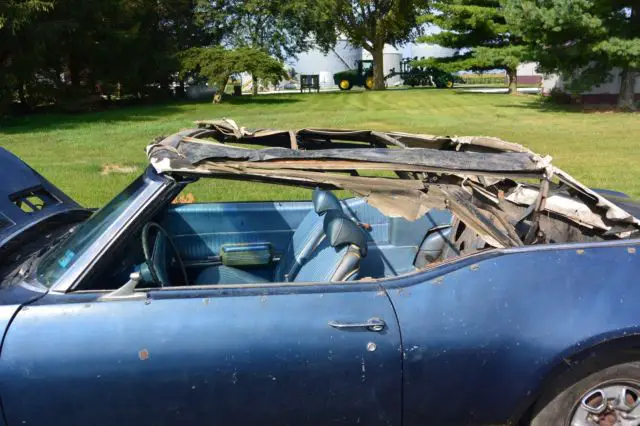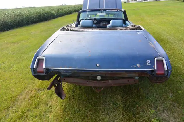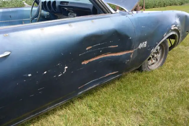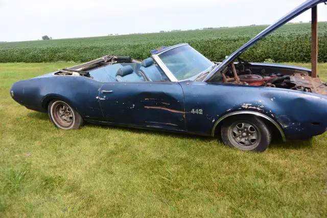 How many unmoleste, complete, # matching 69, 442 convertibles are out there ? Here you have one . VIN # 344679M*******Stored in a barn for the past 23 years. Texas car....floors,trunk, and body have very little rust, magnet sticks everywhere. Car runs and drives enough to get it on a trailer, but water pump is out. Photos shows what it needs..hood is junk, door could be fixed ?... & easy r/f fender fix. Trunk lip and top header bow have only surface rust, and minor rust on lower fenders.Needs interior, paint, etc.Included are: re chromed bumper, exhaust tips and hood louvers. Also have new top boot. Side trim also included. Easy restoration.I have a hood, door, and dash if needed, but not included
