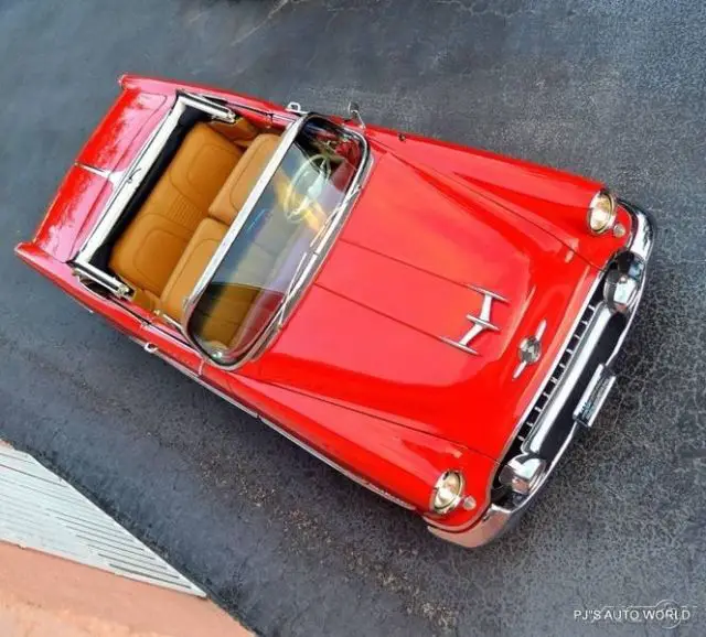 Restomod 1955 Oldsmobile 98 Starfire Convertible For Sale. 350 cubic inch V8 engine dressed to look like the factory engine right down to stamped rocket valve covers, Holley 4 barrel carburetor, headers, dual exhaust, automatic transmission, modified frame and suspension, adjustable ride height using the controllable air ride suspension, 4 wheel power disc brakes, 15" painted steel wheels with hub caps and BF Goodrich radial white wall tires, beautiful red exterior, tan canvas power convertible top, rich leather interior with high thread count luxury carpeting, power windows, custom floor mats upholstered trunk compartment. Owning a up to date classic like this is a once in a lifetime opportunity, are you ready to seize the day? Automotive Facts: The Oldsmobile 98 (sometimes spelled Ninety-Eight after 1958) is the full-size flagship model of Oldsmobile that was produced from 1940 until 1996. The name "” reflecting a Series 90 fitted with an 8-cylinder engine "” first appeared in 1941 and was used again after American consumer automobile production resumed post-World War II. It was, as it would remain, the division's top-of-the-line model, with lesser Oldsmobiles having lower numbers such as the A-body 66 and 68, and the B-body 76 and 78. The Series 60 was retired in 1949, the same year the Oldsmobile 78 was replaced by the 88. The Oldsmobile 76 was retired after 1950. This left the two remaining number-names to carry on into the 1990s as the bread and butter of the full-size Oldsmobile lineup until the Oldsmobile Regency replaced the 98 in 1997. As it was the top-line Oldsmobile, the series had the most technologically advanced items available, such as the Hydramatic automatic transmission, the Autronic Eye, an automatic headlight dimmer, and Twilight Sentinel (a feature that automatically turned the headlights on and off via a timer, as controlled by the driver), and the highest-grade interior and exterior trim. In 1955 the Oldsmobile 98 again had a longer wheelbase than the 88. Standard equipment included turn signals, bumper guards, stainless steel molfings, dual horns, cigarette lighter, front and rear floor mats, inside rearview mirror, foam rubber seat cushions, stainless steel rocker panel moldings, front seatback robe cord, spun glass hood insulation, rear window ventiplanes, electric clock, stainless steel wheel discs, custom cushion lounge seats front and rear, hand brake light, courtesy light package, padded dash, Deluxe steering wheel with horn ring, and windshield washer. Upholstery choices were covert and pattern cloth, leather and pattern cloth, leather and nylon, and leather and dimple leather. Standard tire size was 7.70 (196) by 15 inches (381 millimetres). The optional air conditioning unit was moved to the engine bay instead of the trunk.[5] The turning diameter was 43 ft.[6] The Hydramatic automatic transmission gear selector had an S on it, which was used for better performance climbing hills.[7] At mid-year, Olds introduced the new pillarless four-door hardtop body, dubbed the Holiday sedan, in the 98 series. The 4-door Oldsmobile 98 Holiday, along with the 4-door 88 Holiday and the 4-door Buick Century Riviera and 4-door Special Riviera, were the first 4-door hardtops ever produced. Perhaps because of the popularity of the new 4-door hardtop body style total 98 sales set a new record of 118,626.