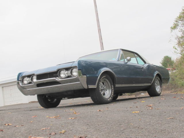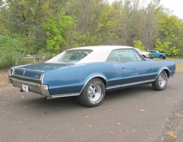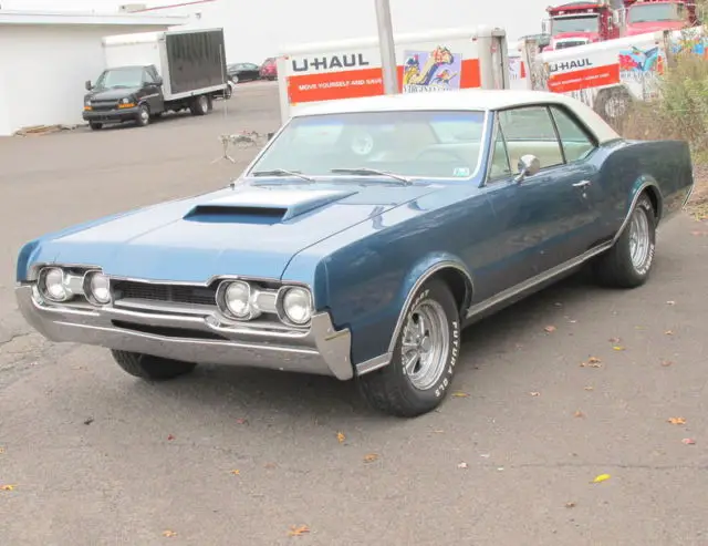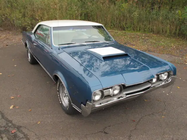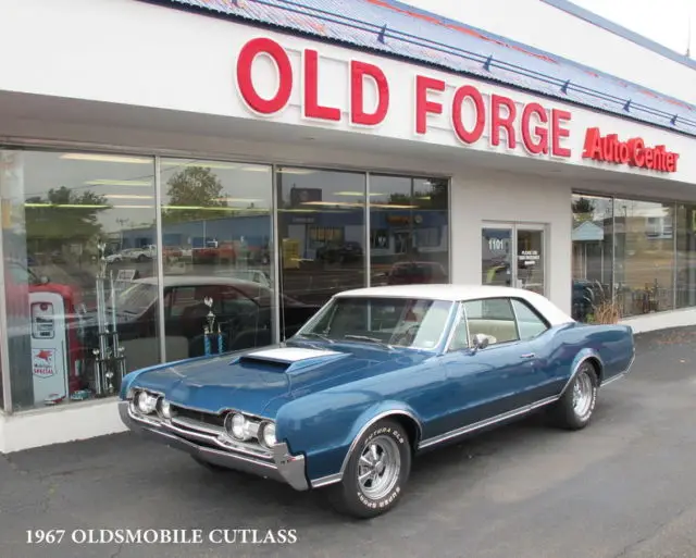 OLD FORGE Motorcars presents this great looking, great running 1967 Oldsmobile Cutlass Supreme. This Cutlass Supreme has had two owners since 1989 and one of these owners actually owned the car twice! Since 1994 this Cutlass has undergone a cosmetic re-freshening. The blue exterior/white top paint is 6 years old and still shows well. The interior upholstery (done by Jim Hartman) is in great shape. At one point the original engine was swapped out for a 425 ci V-8. There appears to be no rust on this car. Some new or replaced parts include: front springs, bushings, shocks, hood insulation, water pump, Offenhauser valve covers. This Cutlass Supreme is now ready for a new home.