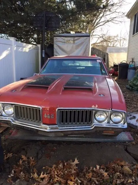1970 oldsmobile442 coupe, car was found sitting in a garage since 1999. the car was pulled out in october2017. the car is a MATCHING NUMBER 442, the block is stamped with "F" block (#396021). "E" heads,aluminum intake,rochestercarb (#17055265) PS,PW,PB,PT, FACTORY A/C, the car has a CLEAR title. the car has a 1971 big block motor in the photo's. the MATCHING # motor is out of the car. so 2 big block engines. the car is worth saving, floors are solid, frame is solid. the sheet metal NEEDS to be replaced or fixed. the car is a RESTORATION PROJECT! summer is coming......