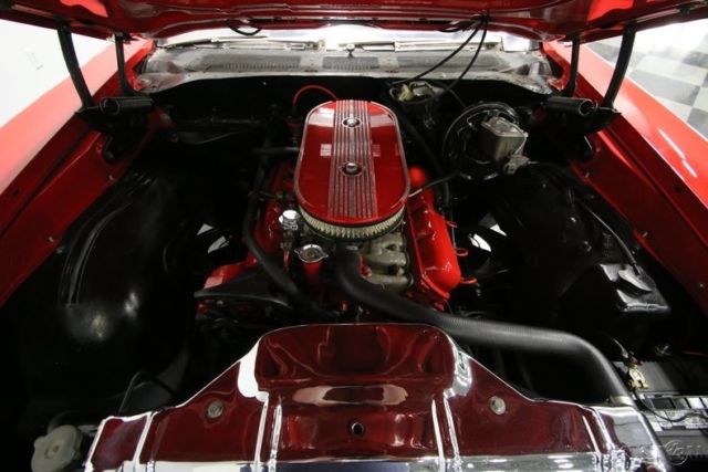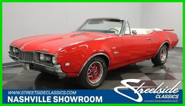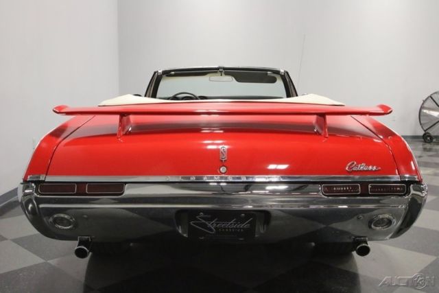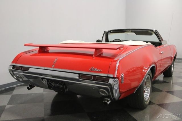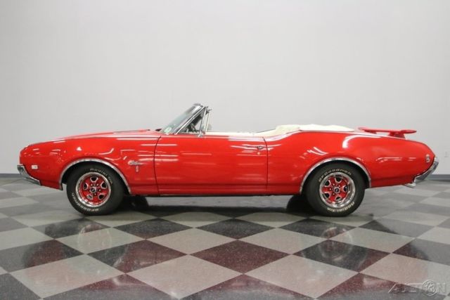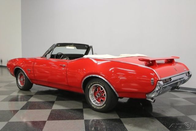 Eye catching in Scarlet Red, this Cutlass looks good with its muscular, yet graceful body lines. But as an intermediate sized muscle car, it has the power and attitude for fast fun in the sun along with plenty of room for friends or family to join with you in your top down adventures. The Red paint on this car was professionally applied with a basecoat/clearcoat process only after plenty of preparation to get the flat and straight lines of the body true, and the curved lines of the body smooth. The results are impressive. Light dances off the car as it moves down the street and bends over the hood and fenders when its sitting still. The chrome bumpers and stainless on this car are really sharp too. Up front it trims out the grill and surrounds the quad headlights uniquely separated by the marker lights. It highlights the upper line of the fenders and doors from front to rear and outlines the wheel wells. The view from the rear of the car is simple but intimidating. A wing is perched on top of the trunk that slopes smoothly down to Oldsmobile and Cutlass in script along with a Supreme badge, and simple rectangular taillights are underlined by a big chrome bumper and dual exhaust tips. Open the door, or just take a look inside this car if the roof is down, and you will find an interior of white upholstery with black carpeting and dash that perfectly complements the red paint. It is all new, completely replaced and installed as part of the restoration of the car. The door panel has vertical pleats on the top two thirds and black carpeting on the bottom with delicate chrome piping highlights. The split bench seat in the front is pleated with decorative smooth vinyl highlights and matches the back perfectly. Rear armrests are nicely stitched and a white boot for the power operated roof when its down gives it all a super clean look. The dash is simple but spotless with a new dash pad and a three spoke steering wheel sits in front of clearly visible gauges with a newer digital radio with tape player for your listening pleasure. When you open the hood, you will find a matching numbers 350CI engine that is both show and go. It's dressed out nicely and has the muscle to get the job done. It starts from the top down with an air filter housing painted car color with brushed metal ribs. Under that are twin Edelbrock carburetors that feed an Offenhauser intake. Valve covers, the engine iron and even the alternator are painted car color. An MSD ignition system and coil assure good spark and it even has red spark plug wires. Free flowing long tube headers extract the spent gasses and feed out to a dual Flowmaster exhaust system. It all works together to make great power and sweet sounds as it's doing it. Power is sent back through a two-speed Powerglide transmission and power front disc brakes help you haul this car back down when you let the horses run. The rubber meets the road through 235/60R15 BFGoodrich Radial T/As all around mounted on steel wheels painted to match the car with chrome trim rings. Eye catching because it's a great looking Red on White convertible. Hard to catch because its packing some serious muscle.