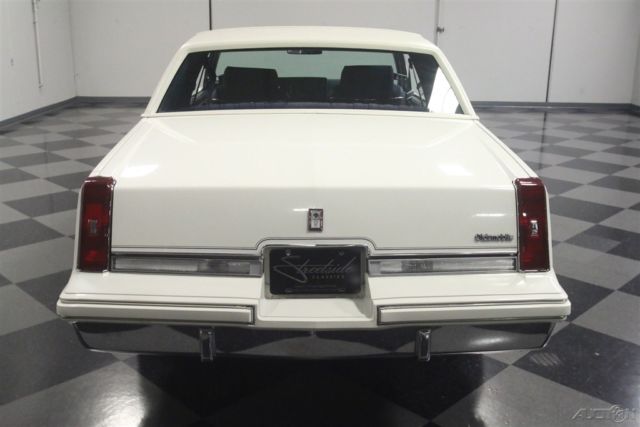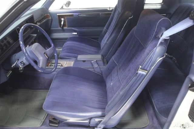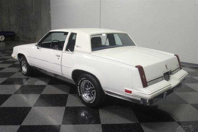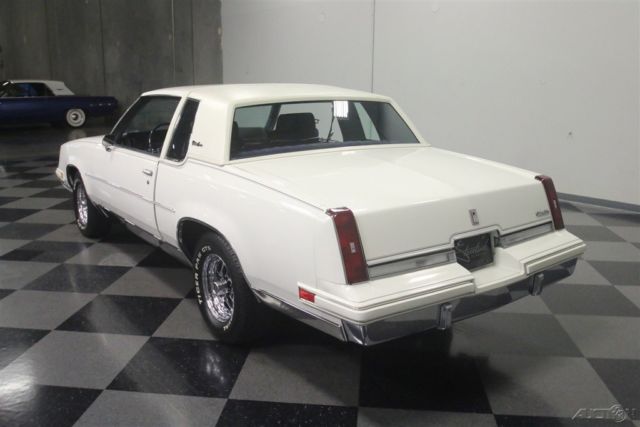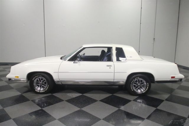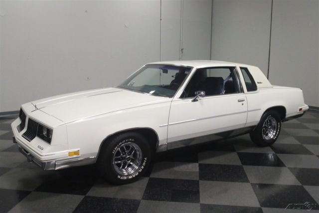 Perhaps it's because there are no more Oldsmobiles being built, but the list of future collectables will surely include cars like this 25,618 original mile 1984 Oldsmobile Cutlass Supreme coupe. From new, these cars have enjoyed a cult following, perhaps due to their classic yet sporty styling, large dose of luxury, and effortless road manners. As is the case with many old cars, people didn't treat these like anything special when they were new, and as a result, finding a clean one like this Olds can be a challenge. Fortunately, it hails from a warm, dry climate and shows off its fantastic condition with shiny white paint and contrasting blue pinstripes. That's factory-original paint circa 1984, and it's simply beautiful with none of the usual chalkiness and fading you saw back in the '80s. The angular styling has aged quite well, and with the 1984 updates such as the vertical bar grilles and blacked-out headlight bezels, it enjoys a semi-performance look that was a hallmark of Oldsmobile in its glory days. The chrome bumpers still look fantastic, showing no evidence that this car was "parked by feel" by an elderly owner, and all the bright stainless trim shines up nicely. And we have to admit that we like the padded roof, which makes it look more formal, which is appropriate for an Olds. Inside, it's pure Oldsmobile thanks to a pair of cloth buckets flanking a center console and a long list of luxury features. With blue GM mouse fur upholstery, it remains in excellent condition with no rips or tears and very few signs of UV damage, which is more evidence that this car was properly maintained. In fact, the back seat looks virtually new and the carpets and door panels have been carefully preserved by a conscientious owner. Wood accents warm up the all-blue interior, and a familiar-looking steering wheel combines with a ton of power accessories to offer a luxurious experience. Factory A/C, a tilt wheel, and cruise control are included, with the original AM/FM/cassette radio still pulling duty in the center stack. An upgraded Oldsmobile instrument panel includes a full set of gauges, including a tach, and the 25,618 miles shown are indeed authentic. One of the hallmarks of a full-sized luxury car is trunk space, and the cargo bay on this one is very nicely kept and still carries its original space-saver spare and jack assembly. Power comes from the corporate 5.0 liter V8, which is both unobtrusive and effective in its role aboard the Cutlass. Smooth and torquey, the 4-barrel engine gives the car great road manners, and thanks to a recent tune-up, it cruises in virtual silence at any speed. The engine bay is extremely clean, more evidence of a good life with a caring owner, and it has not been modified in any way, despite being a somewhat mod-friendly powerplant. The A/C appears to still use good old R12 refrigerant to make it extremely effective and all the factory equipment, including the air cleaner, is fully intact, which is always a good sign. The chassis and floors are clean, with no signs of life in the rust belt and the transmission shifts crisply and feeds highway-friendly gears out back. Handsome Oldsmobile Rallye II wheels add to its sporty countenance, especially with 225/70/14 white letter radials on board. Lots of fun today and maybe even a smart investment for tomorrow, these Oldsmobiles will always find a ready group of buyers. If you're one of them, give us a call today!