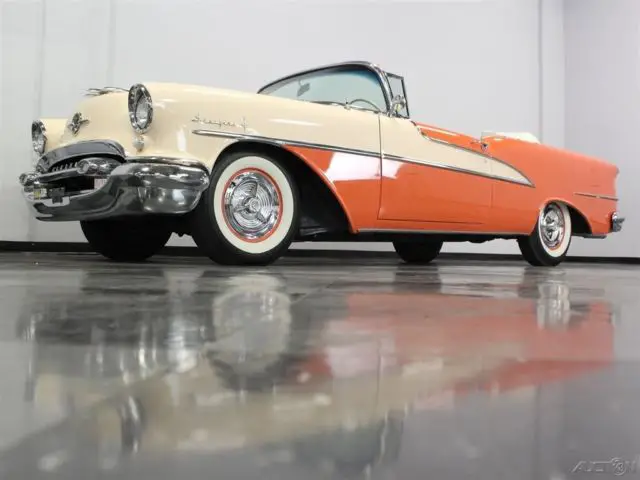 In the days before muscle cars, Oldsmobiles were some of the hottest cars on the road. This 1955 Olds 98 Starfire convertible was not only a fantastic performer in 1955, but it also combined luxury and muscle in a way that still resonates today. A true gentleman's express, it's a bright reminder of how horsepower and style have no fear of time. A true 46k mile car purchased from the estate of the original owner some 20 years ago by the current owner it was still in original condition and lovingly cared for when purchased. It has been very recently repainted in fantastic Coral and Sand Beige, the car's original combination, in PPG base-coat clear-coat. As the top of the line, the Starfire was beautifully dressed in dramatic lines and the two-tone paint accents the stainless side trim, all of which remains in fantastic shape. Other great details include the rocket-like hood ornament, the globe emblem on the hood and trunk, and the jet-exhaust-looking taillight assemblies that definitely reinforce the "Rocket" part of Rocket 88. The spacious two-tone interior offers room for six and a variety of patterns and materials that give it a highly stylized look. Of course, interior designers had to keep up with the body guys, so flashy two-tone door panels work with the sleek dual cockpit dashboard to create a unique driving environment, and they seem to echo the shape of the exterior trim. The slender steering wheel features another globe emblem in its center, and the symmetry of the instrument panel makes it look like the gauges and passenger trim pieces could be easily swapped for right-hand drive versions (which is true). There's plenty of hush mat under the original style hounds tooth carpets that are specifically correct for the Starfire. When purchased, the seats still had the clear plastic seat covers from the 50's and the leather had split on the front seat. So, correct replacements were installed along with new door panels and the look is very authentic. The gauges all show crisp markings and bright faces, and this car carries ultra-rare factory A/C, which was almost completely unheard-of in a convertible. The original AM radio is still in the dash, the windows are power-actuated, as is the seat, and the only thing left to replace was the bright white convertible top which still looks almost new. The big trunk is beautifully finished with correct materials, side cards, and a full-sized spare and jack assembly. Oldsmobile's 324 cubic inch V8 wore a 4-barrel carburetor in the Starfire, making it one of the hottest cars on the road. Today 202 horsepower may not be a lot, but remember that the original small block Chevy was only making 150, so the Olds was simply dazzling on the road. The original engine was rebuilt some years ago, but thanks to Oldsmobile's legendary metallurgy, it runs superbly and pulls the flashy hardtop around with a great V8 rumble from the Flowmaster exhaust system. The original 4-speed HydraMatic automatic transmission has characteristic firm shifts that feel great, almost like it's got a shift kit. Power steering is also part of the package, making this car very easy to drive, and the undercarriage is nicely preserved, with correct finishes on the components and plenty of evidence of recent service work. The original wheels and hubcaps are framed by a set of flashy whitewall bias-ply tires that fit and look right. High-fashion fun, this Olds represents performance in the days when it was built into every car Oldsmobile built, with a little luxury on the side. When everyone else is driving their Shoebox Chevys, you'll stand out in this spectacular Starfire convertible. Call today!