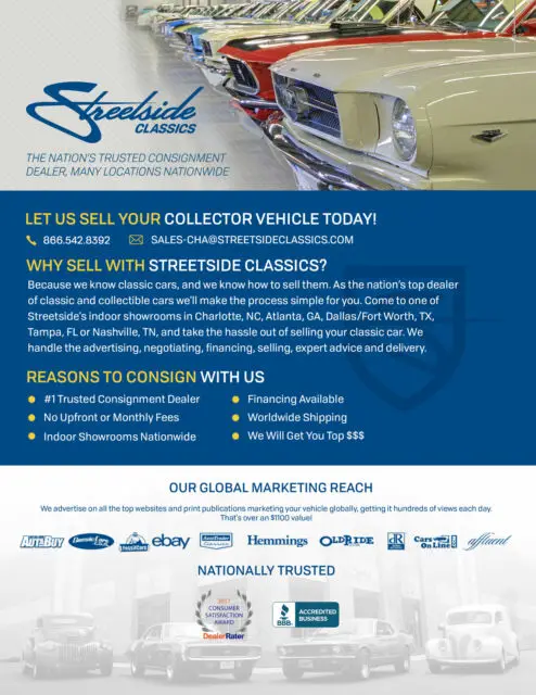About Streetside Classic Cars Nashville [zipedit] Streetside Classics | eBay Template| Guitars and Cadillacs. Hot Rod Lincoln. One Piece at a Time. Yeah, y’all are on the right track. Come to Nashville for some hot chicken, country music, and classic cars. Our showroom is located just 20 minutes southeast of downtown in La Vergne, TN in the Centrepointe Distribution Park. This 50,000-square foot indoor showroom opened in 2016 and can hold approximately 250 vehicles. We are open to the public and showroom admission is always complimentary. Our Global Marketing Reach We advertise on all the top websites and print publications marketing your vehicle globally, getting it hundreds of views each day. That's over an $1100 value! Nationally Trusted Finance Financing Classic & Collector CarsLet our money work for you! With rates as low as 6.00% and an average appreciation of 9.00% a year it doesn't always make sense to pay with cash.